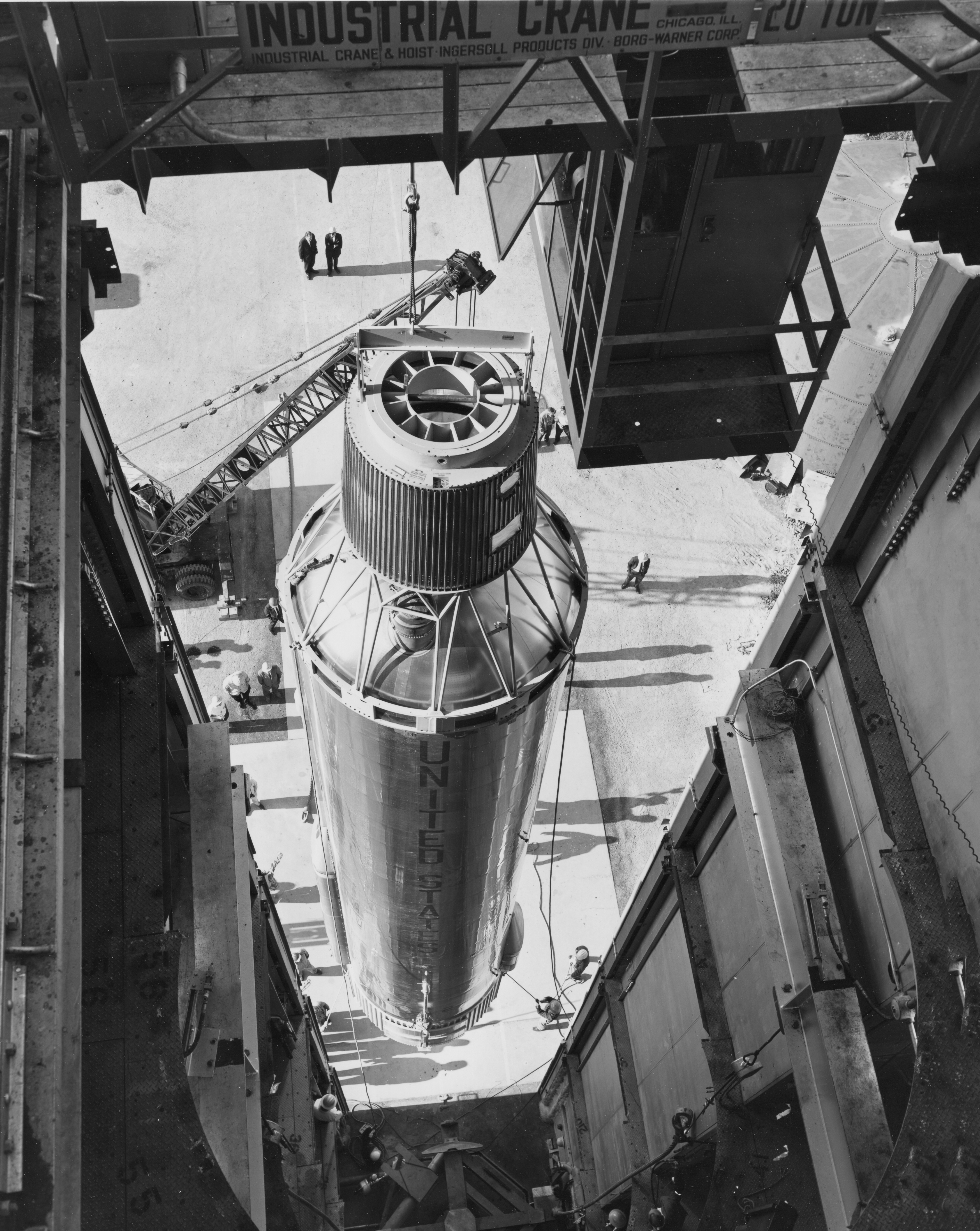 Installation of an Atlas missile into E Stand for dynamics testing (1963).