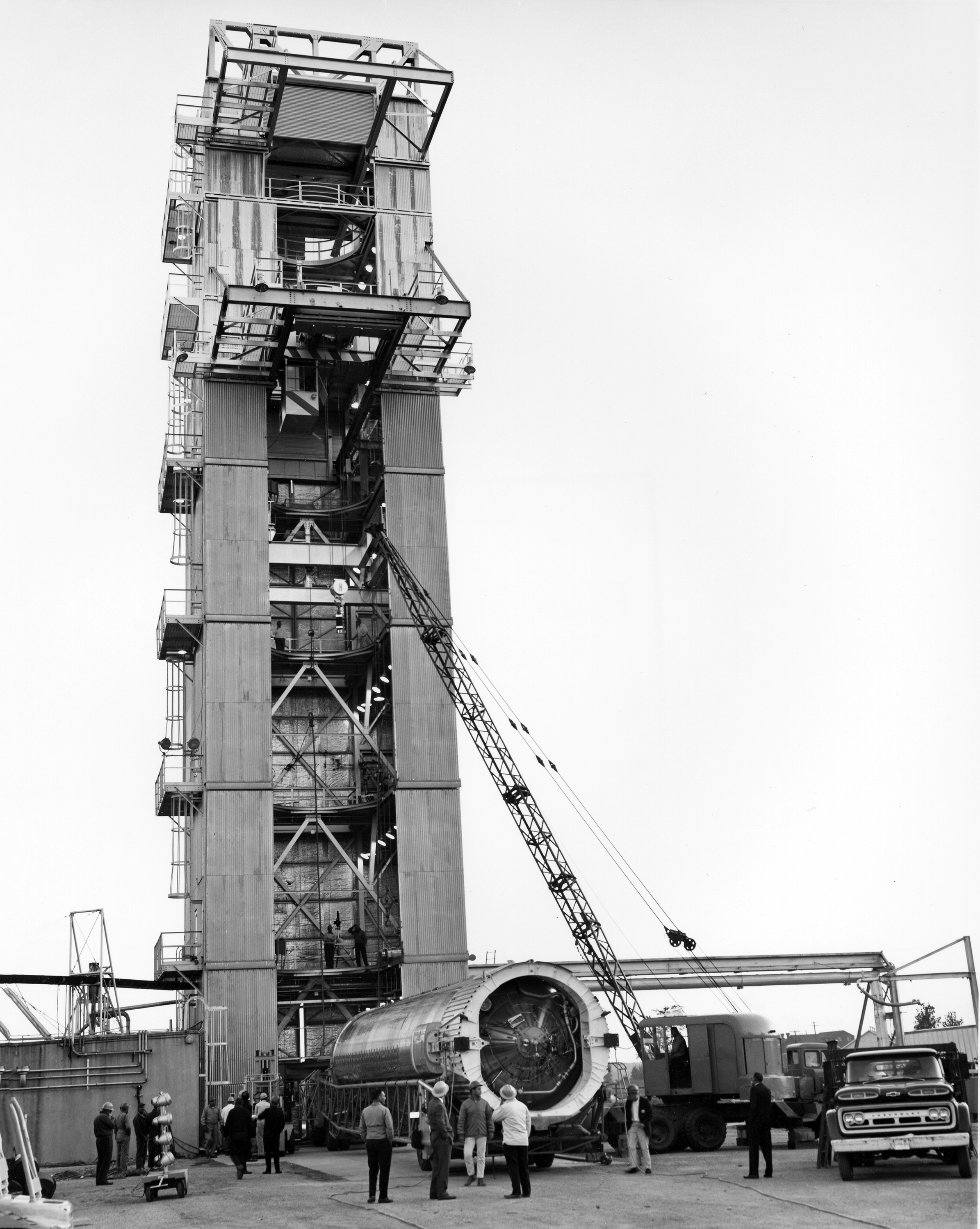 Installation of an Atlas missile into E Stand for dynamics testing (8/15/1963).
