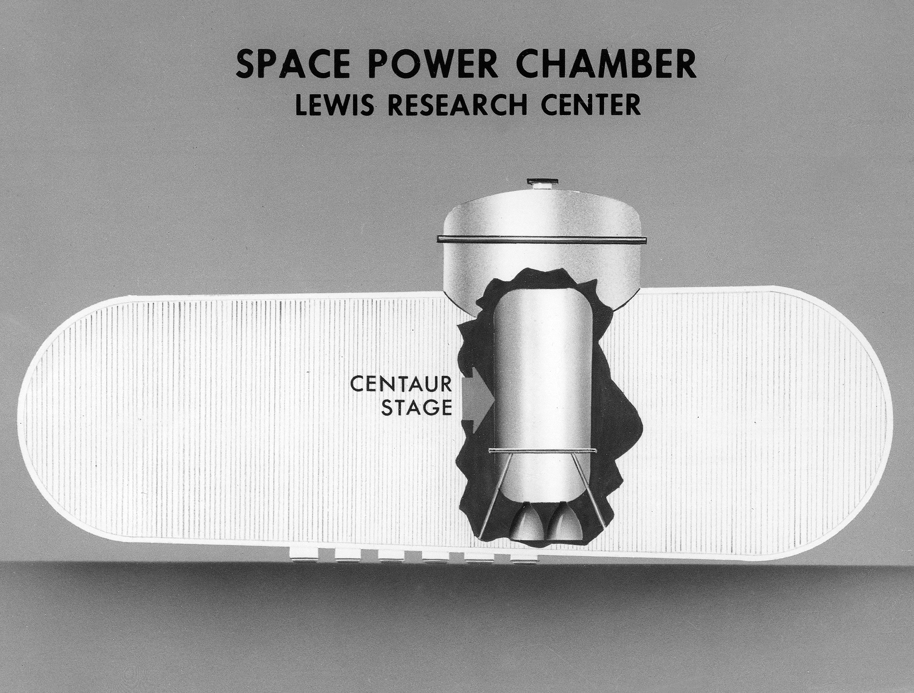 Drawing of a Centaur stage in the Space Power Chamber No. 1 vacuum tank (1964).