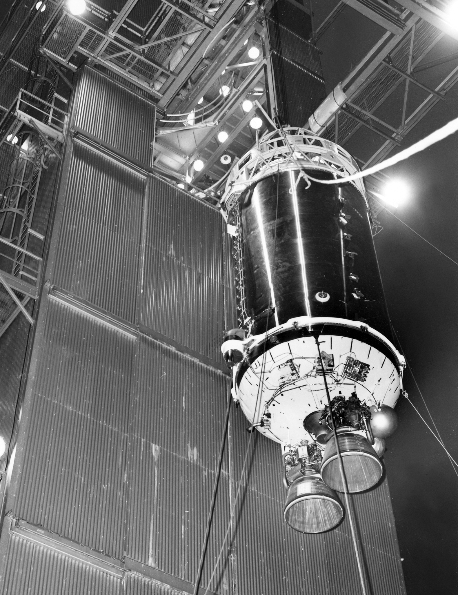 Raising of a Centaur stage into E Stand at Plum Brook Station where it was mated with an Atlas booster and subjected to vibrational and load testing (1/20/1964).