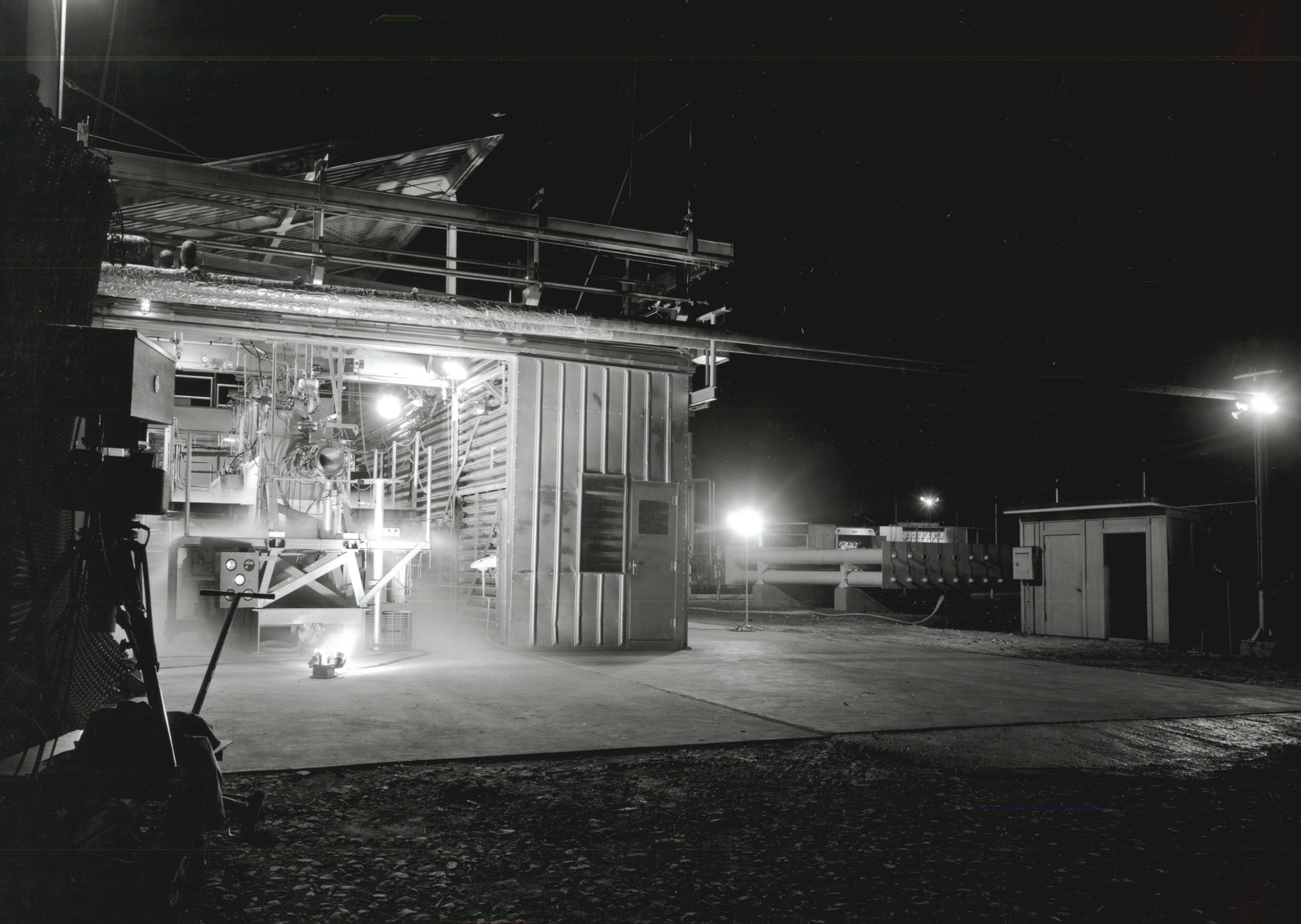 Test of a gaseous hydrogen-liquid oxygen rocket engine at J Site's J-1 test stand in August 1962.