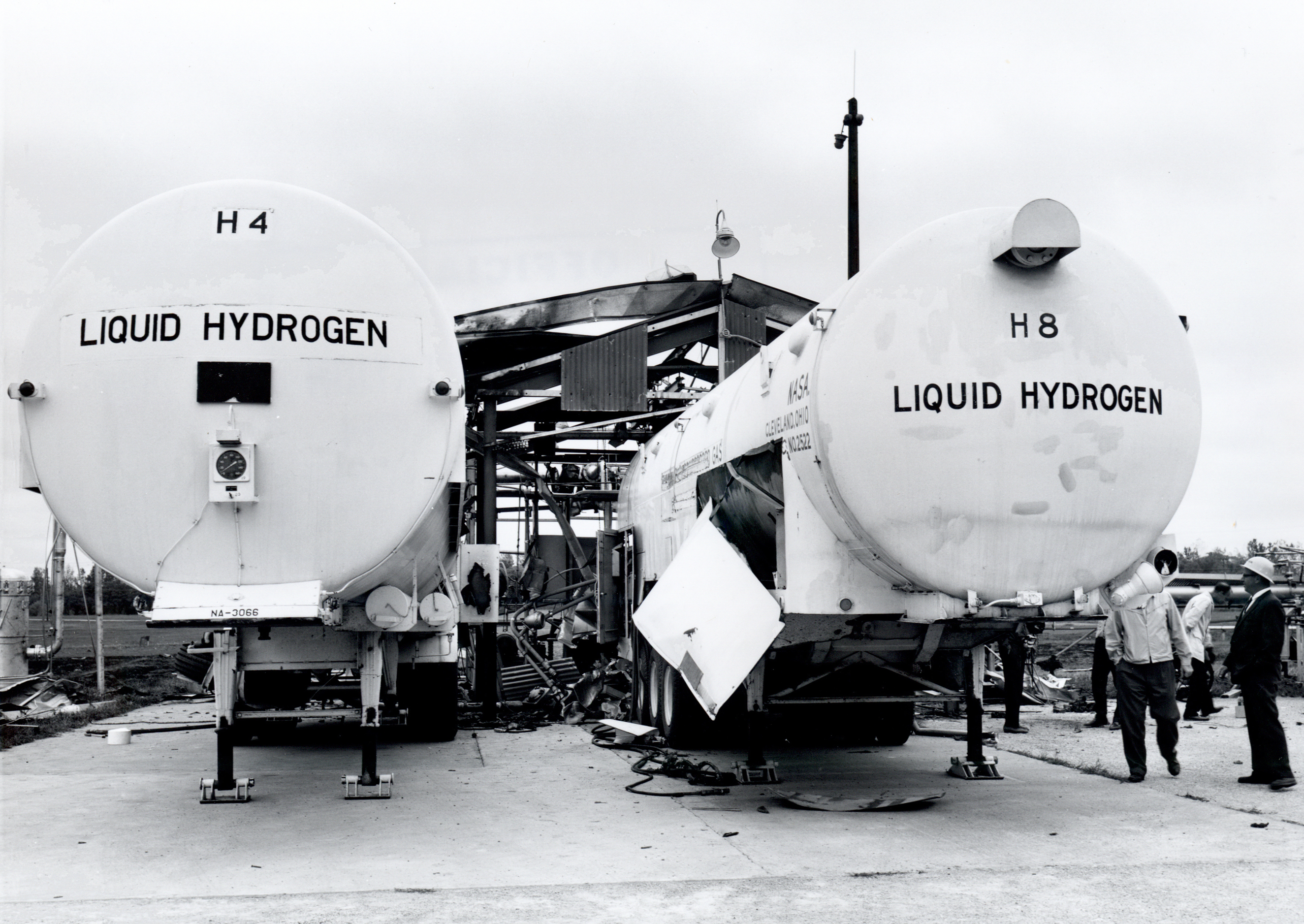 Two liquid hydrogen trailers at the Pilot Plant after a hydrogen explosion destroyed much of the facility (7/10/1964).