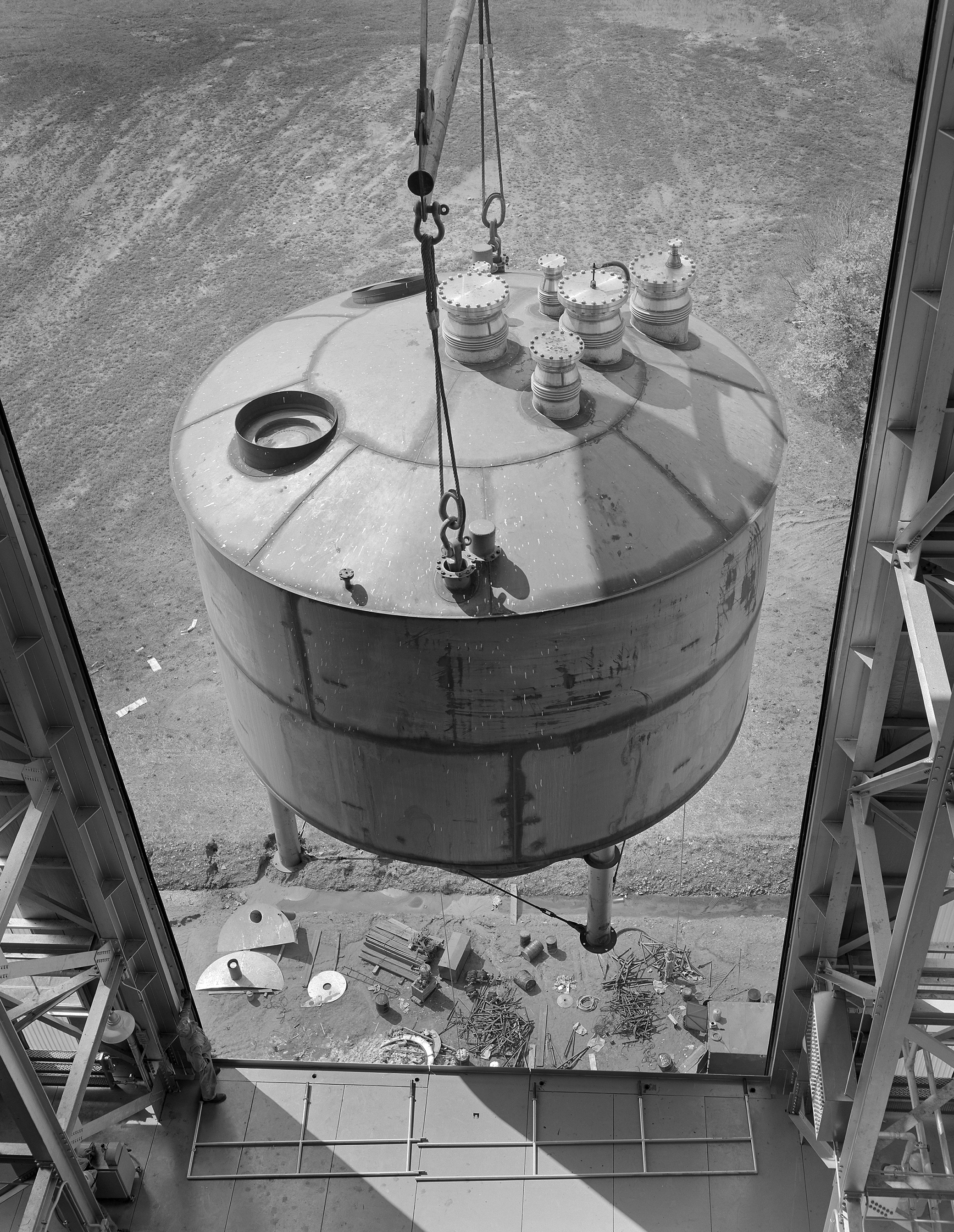 Installation of a propellant run tank during construction of the B-3 stand. The 65-ton crane was used to install equipment and test articles (8/6/1963).