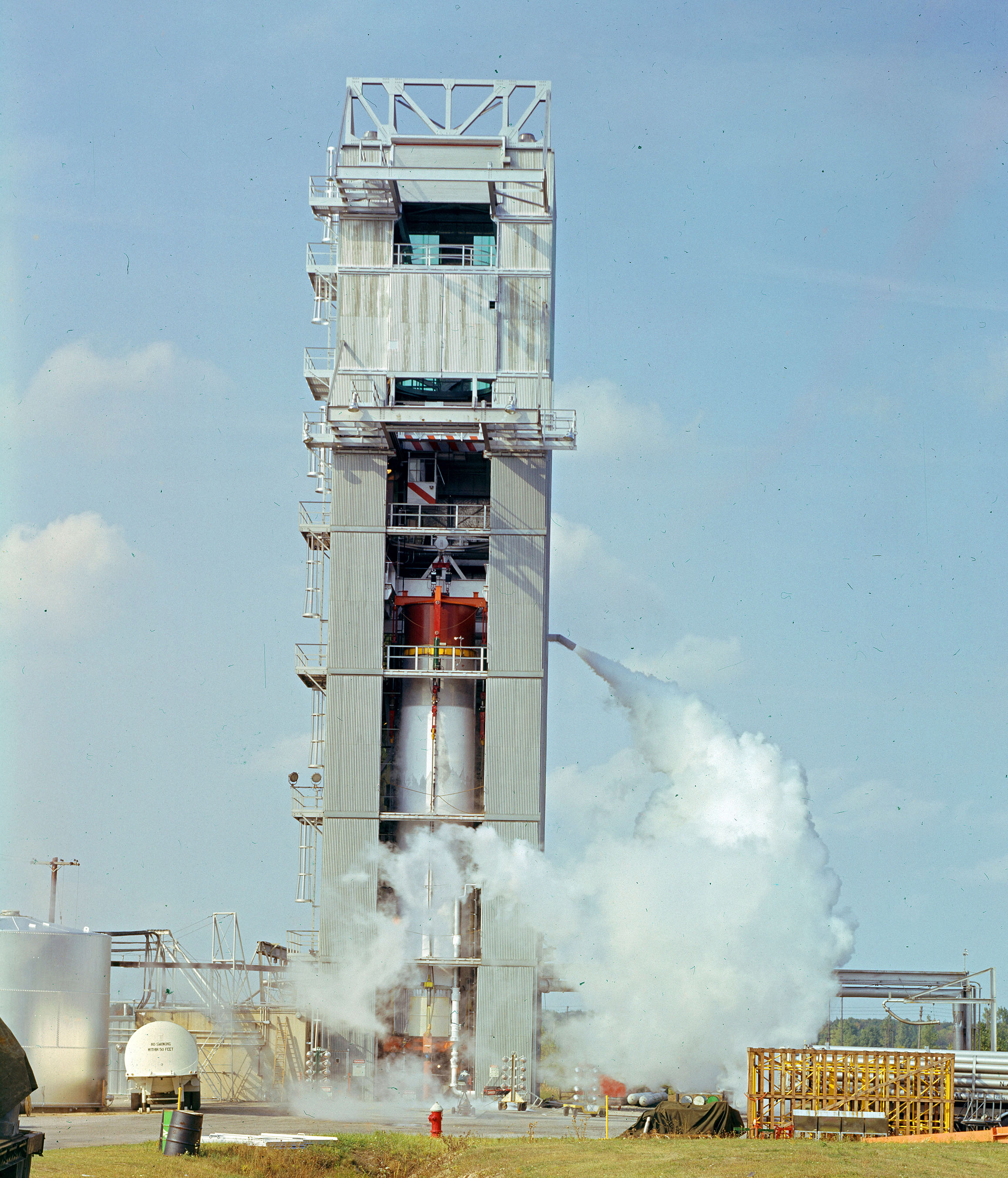An Atlas missile installed at E Stand for torsional tests. A Centaur stage was added to the Atlas for verify the vehicle's ability to withstand lateral and longitudinal forces (2/15/1965).