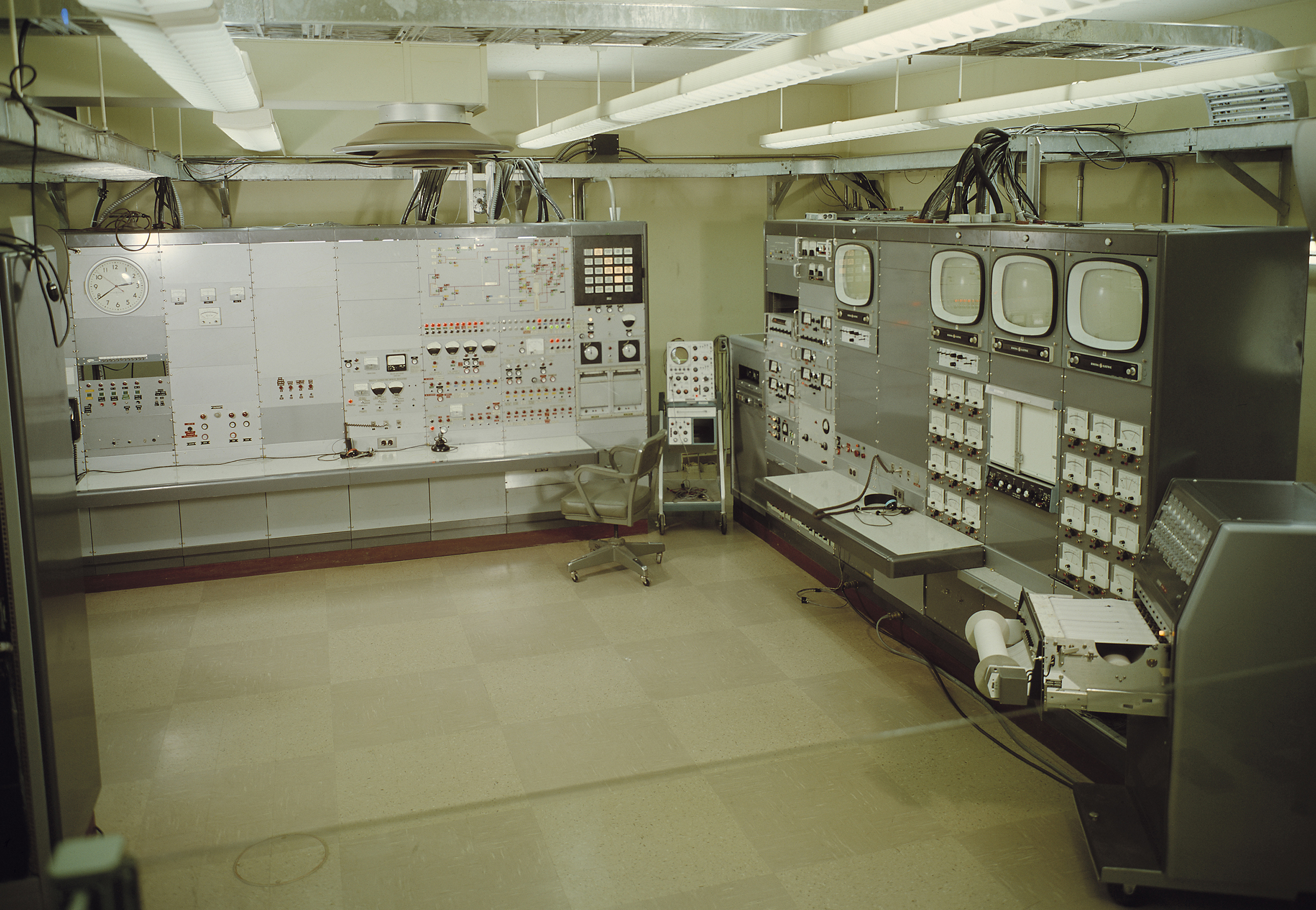 Control panels for the B-1 test stand inside the B Control and Data Building