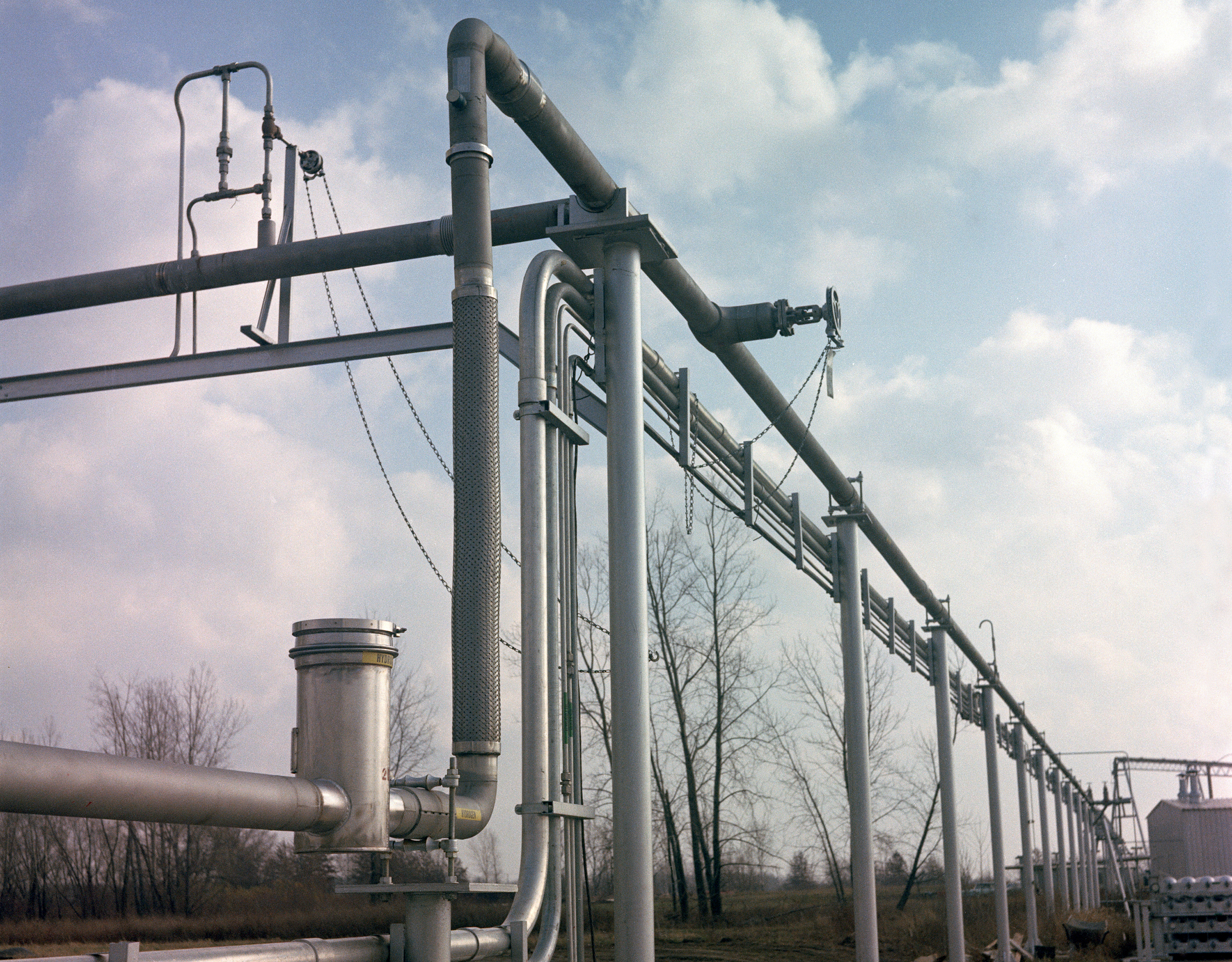 This three-inch-diameter vacuum-jacketed line connected a 200,000-gallon liquid hydrogen Dewar to the B-3 test stand (11/20/1965).