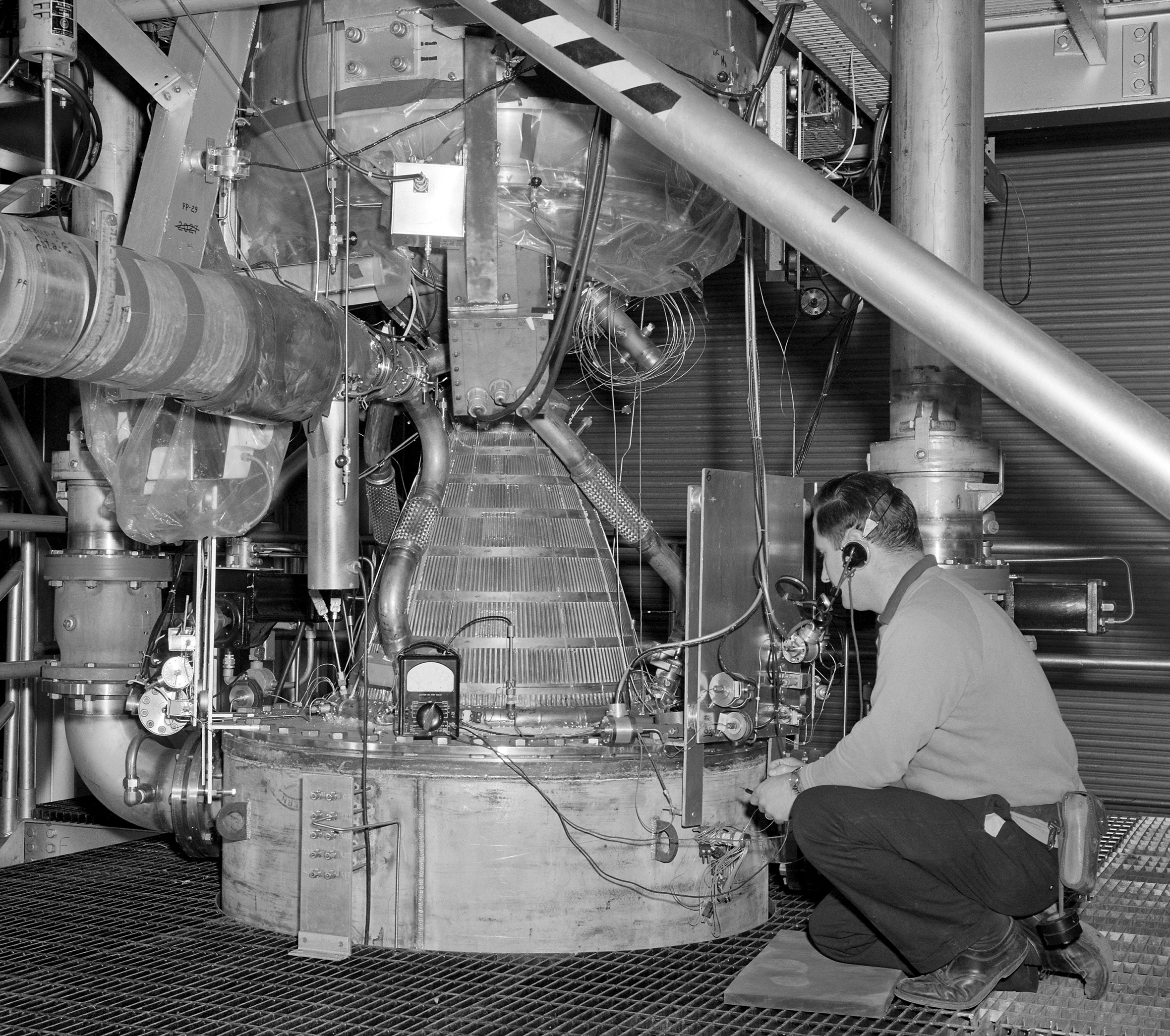 Technician working on Mark IX turbopump for the Kiwi B-1B in the B-3 test stand (5/10/1966).