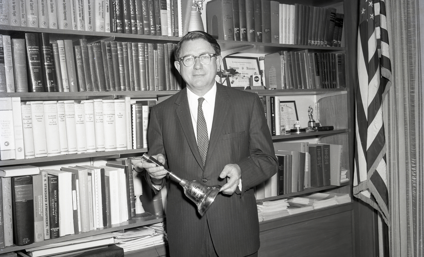 Center Director Abe Silverstein in his remodeled office in Room 111 of the Administration Building (1969).