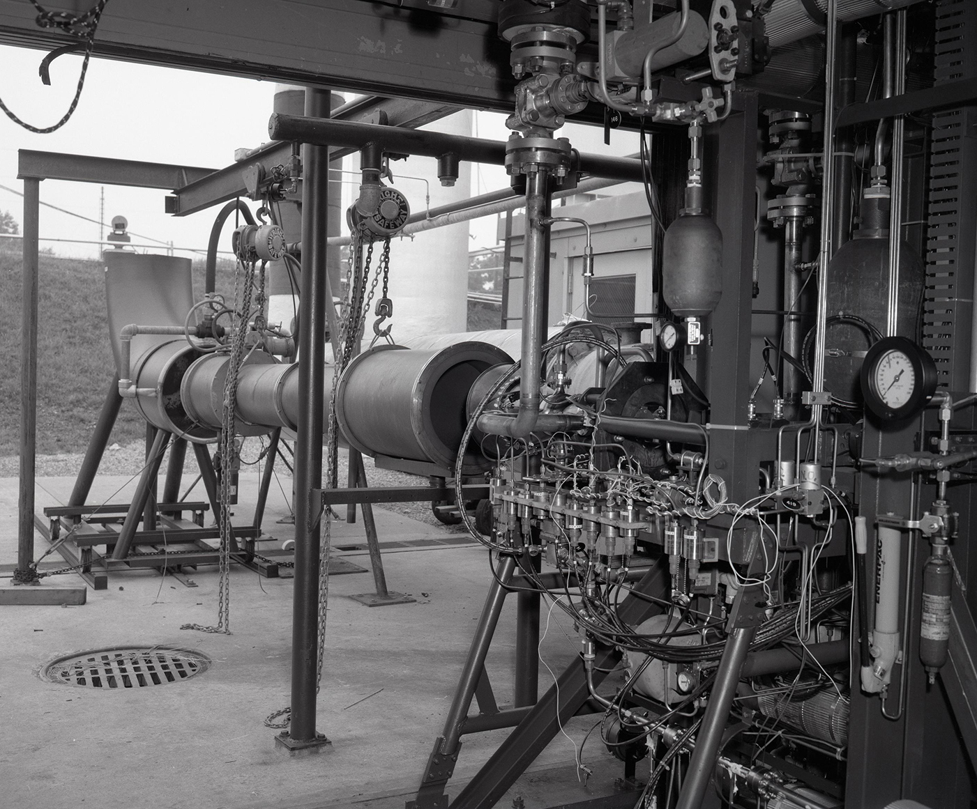 Entire ACPS thruster assembly set up in Cell 21 of the Rocket Lab in June 1972.