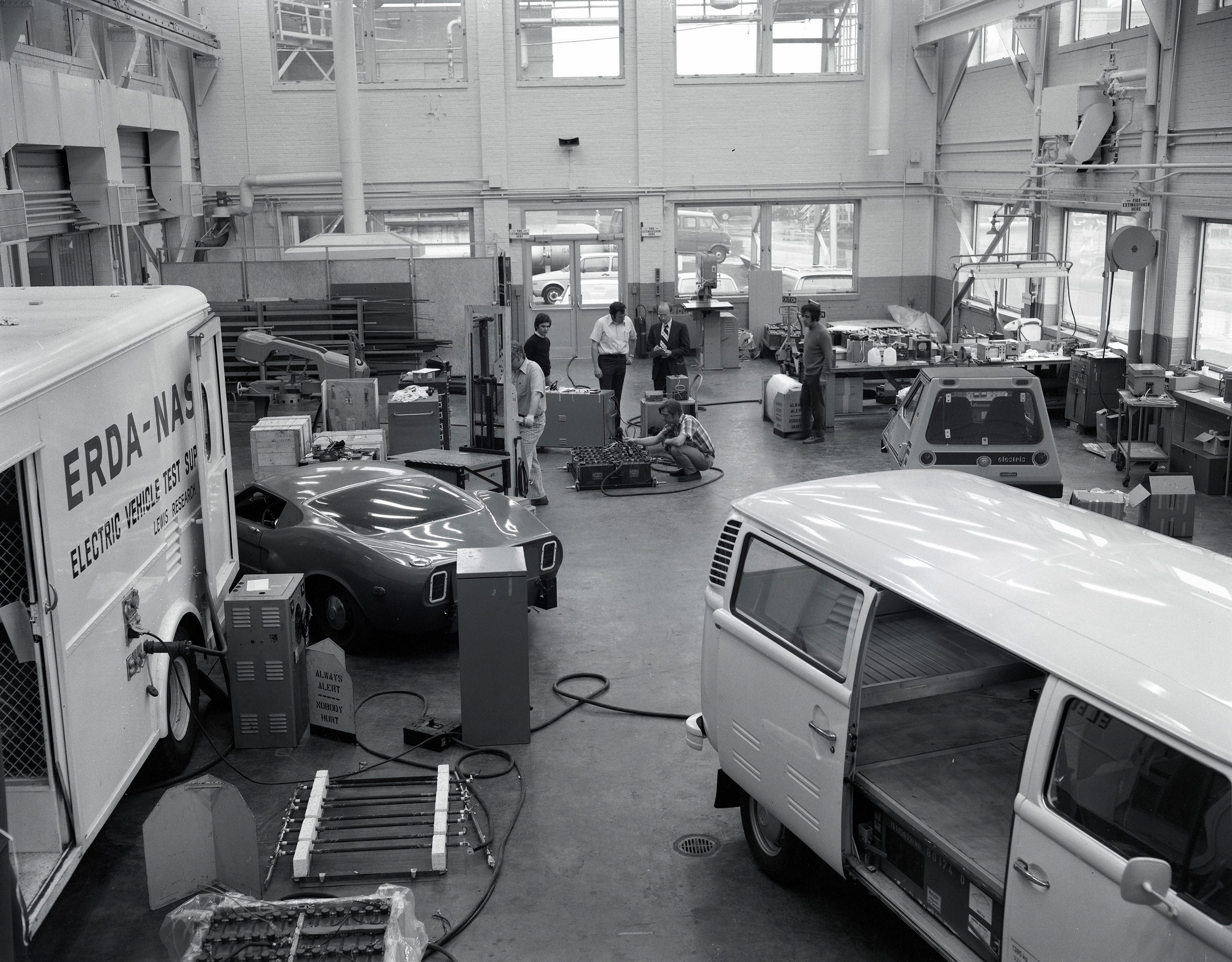 The Space Power Chamber shop area was used to store and work on vehicles during an extensive electric automobile study in the mid-1970s. (5/4/1977)