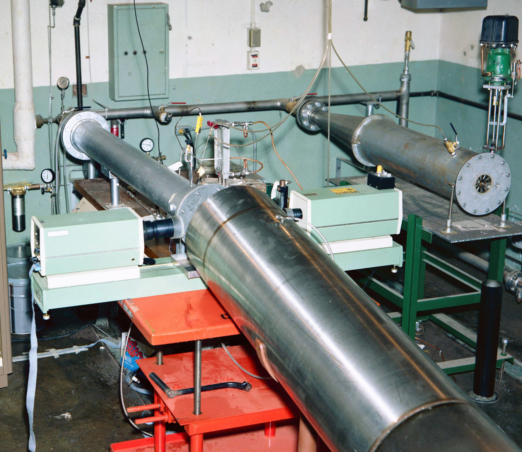 Cell 21 combustor test setup showing exhaust duct, laser equipment, and rotameter (1984).