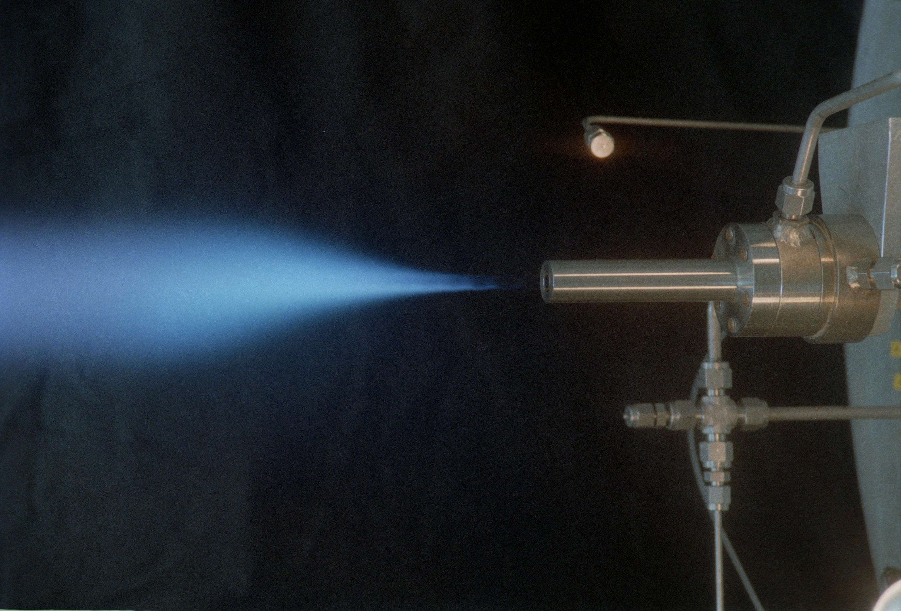 Testing of a liquid oxygen and methane thruster in Cell 21 of the Rocket Lab (1988).