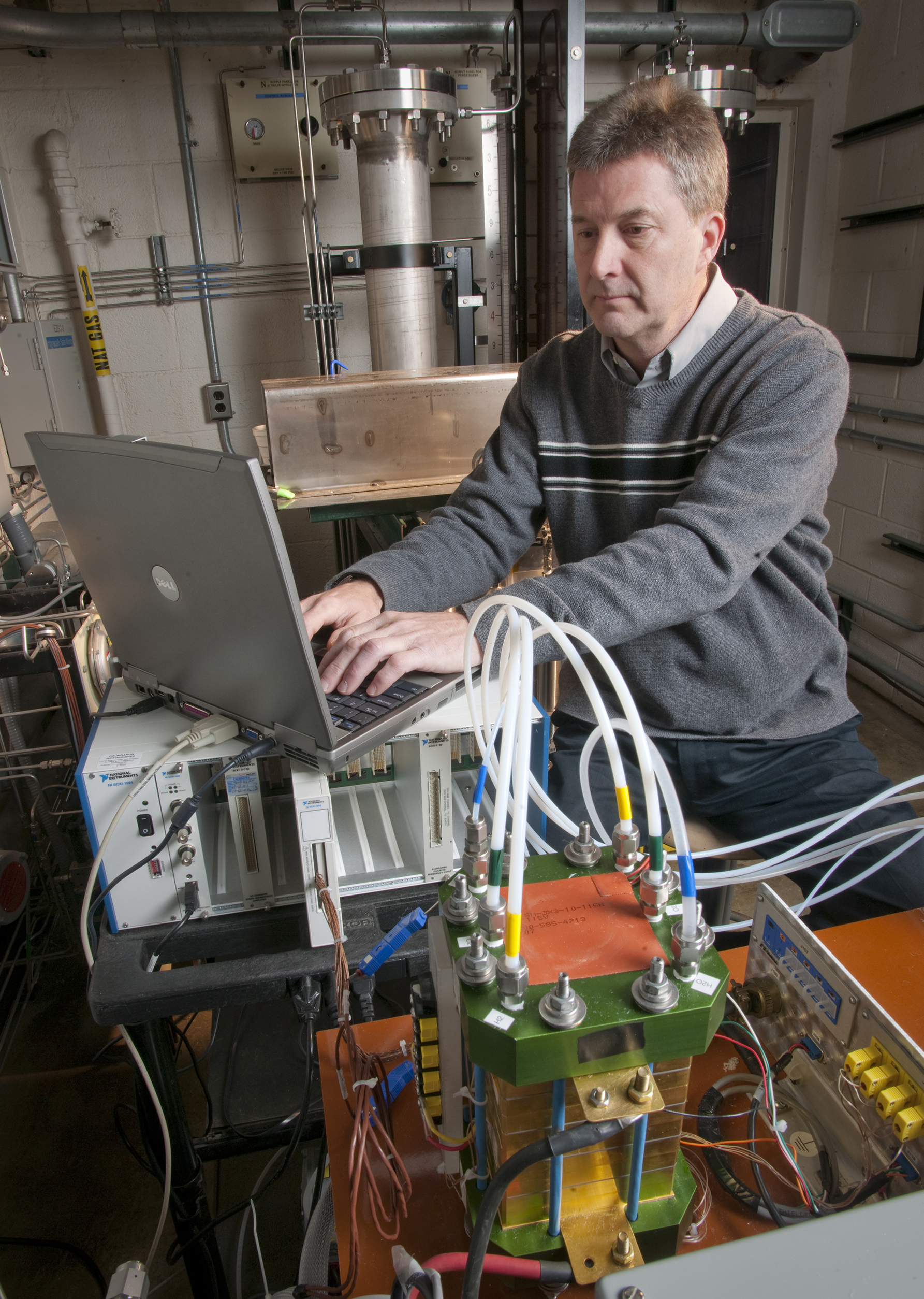 A NASA researcher preparing to test a hydrogen-oxygen PEM fuel cell stack in 2009.