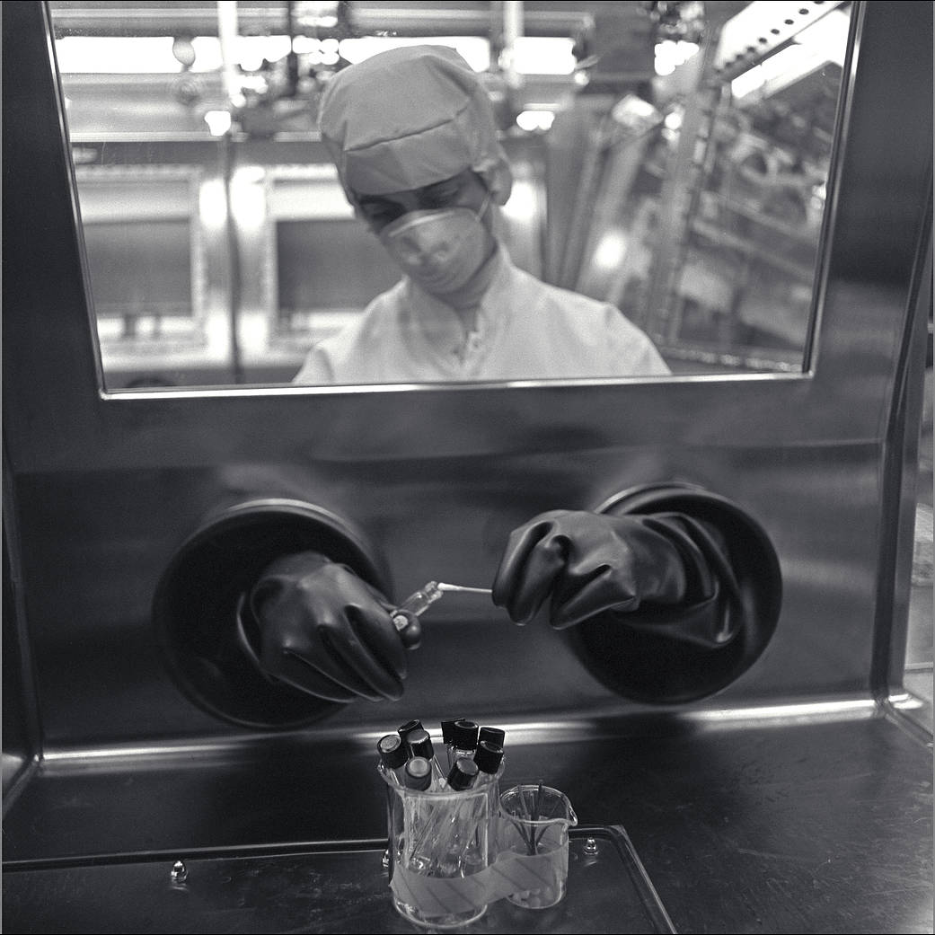 Biologist Elaine Muñoz transfers an Apollo 11 lunar sample in the glove box in NASA Ames’s Lunar Biological Laboratory.