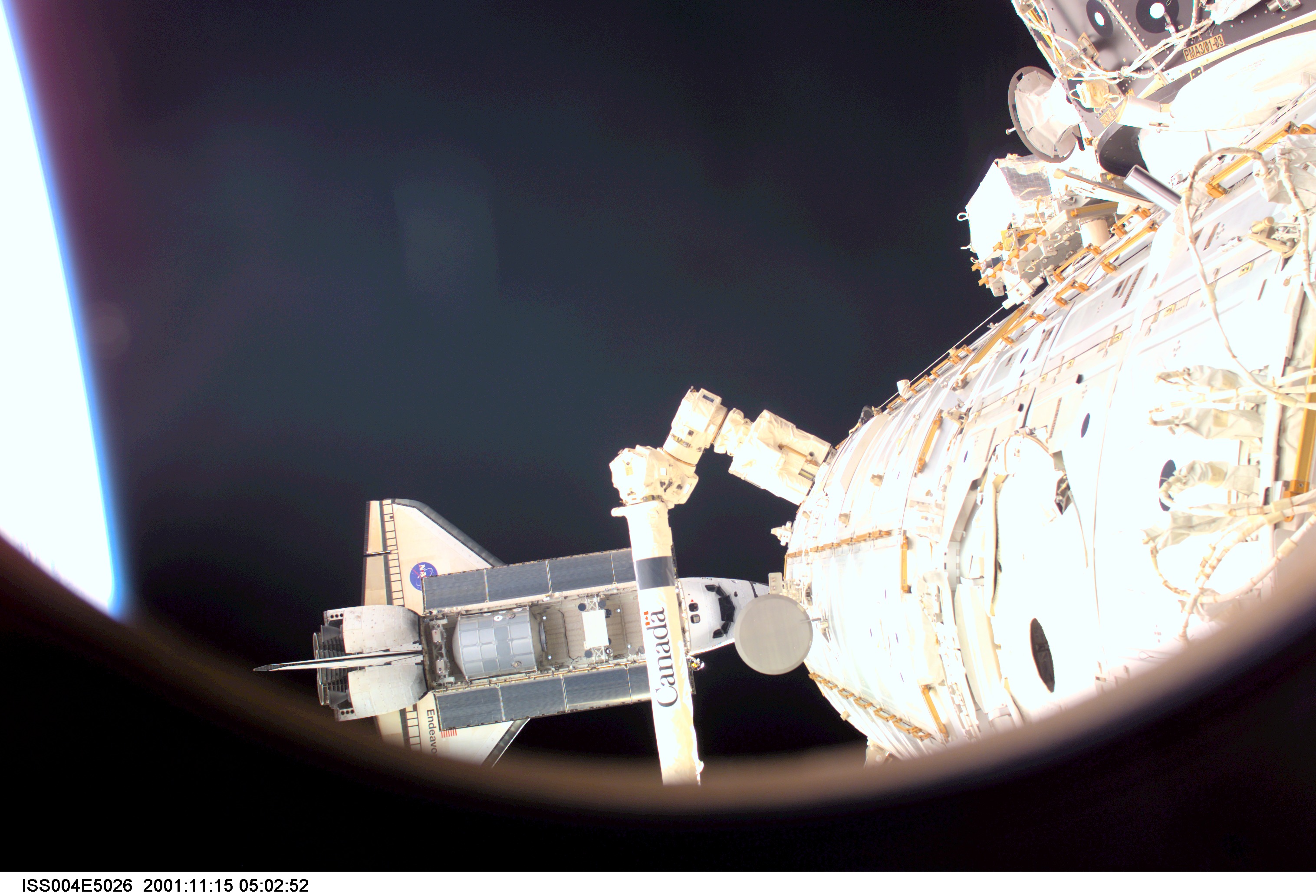 ISS004-E-5026 (15 December 2001) --- As seen through a window on the International Space Station (ISS), the Space Shuttle Endeavour is photographed as it undocks from the station. A portion of the Canadarm2 is visible in the foreground. The image was taken with at digital still camera.