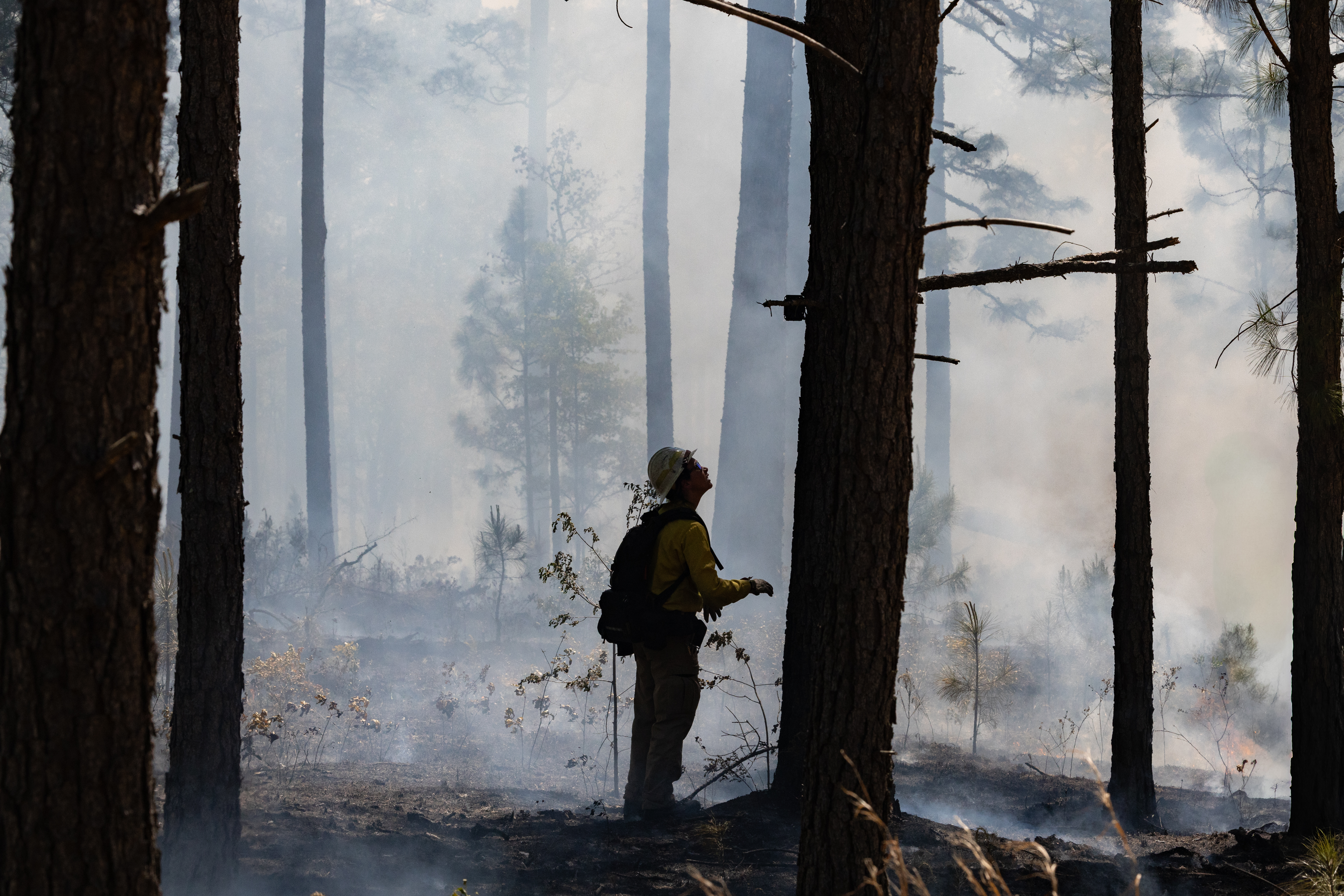 Wildland fire manager Aisha Wiig examines a longleaf pine tree after a prescribed burn has moved through the area. These prescribed burns are ecologically necessary for the plants and animals in the longleaf pine ecosystem, and reduce fuels that could be accidentally ignited due to lighting strikes or military training operations. FireSense, the Department of Defense, and their partners use prescribed burns such as this one to develop and test tools and technology to make wildland fire management safer and more effective.