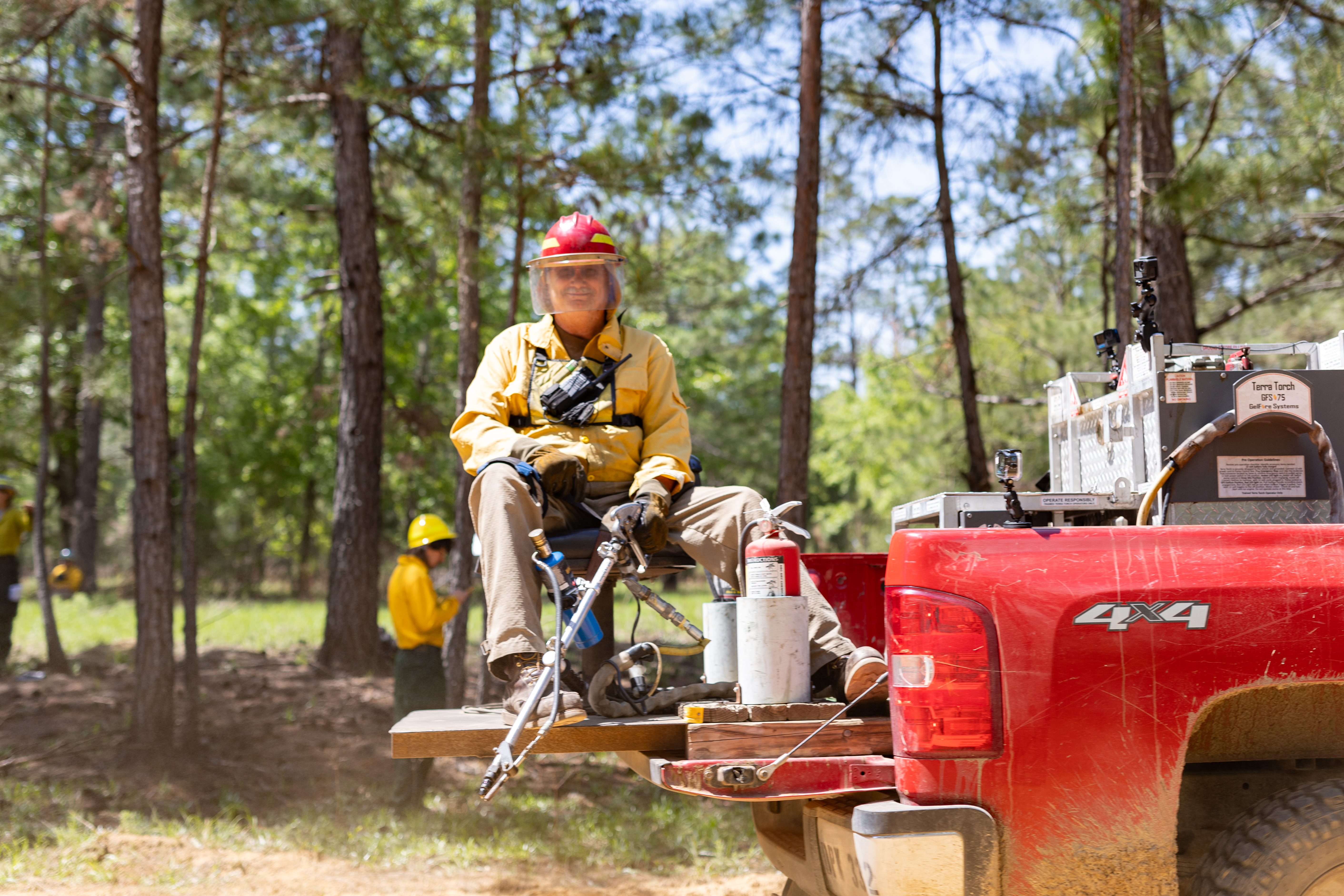 A firefighter sits on the back of an ignition truck called a "terra torch" during a prescribed burn operation at Fort Stewart-Hunter Army Airfield in Georgia. The device shoots a flaming jelly, which fire managers use to ignite the perimeter of a burn.