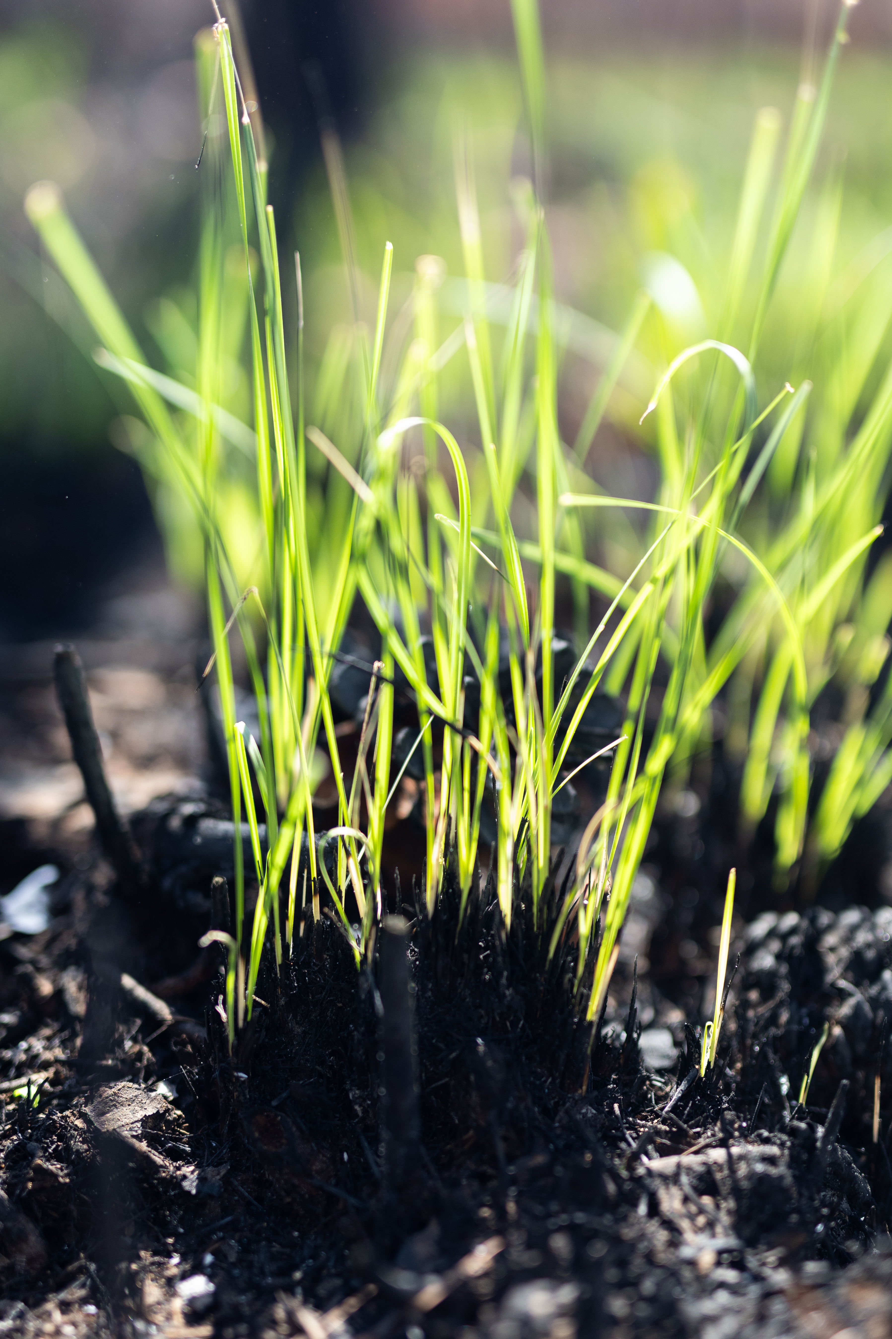 Green grass shoots reemerge from the earth less than a week after a prescribed burn at Fort Stewart-Hunter Army Airfield in Georgia. These prescribed burns are ecologically necessary for the plants and animals in the longleaf pine ecosystem, and reduce fuels that could be accidentally ignited due to lighting strikes or military training operations. FireSense, the Department of Defense, and their partners use prescribed burns such as this one to develop and test tools and technology to make wildland fire management safer and more effective.