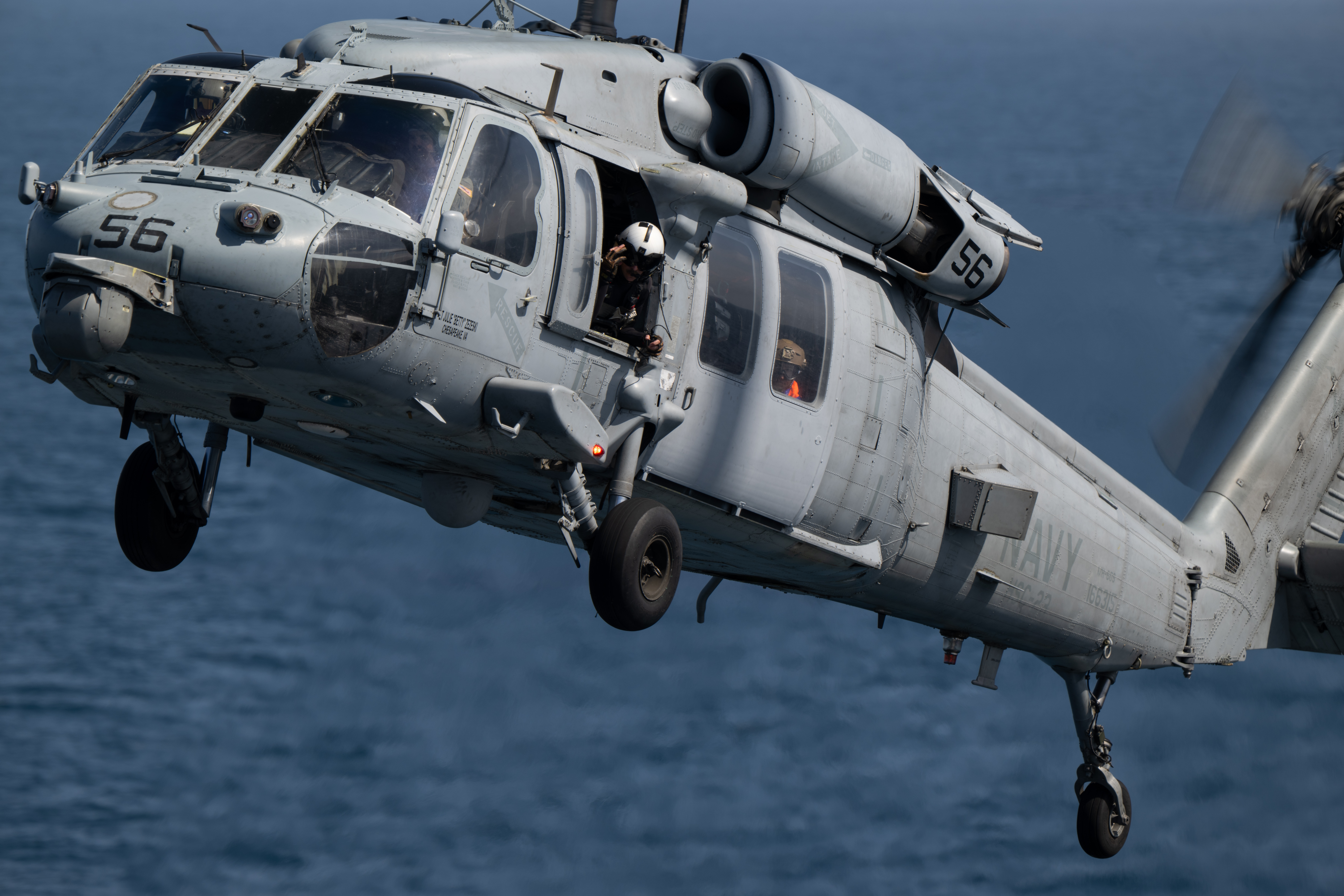 ESA (European Space Agency) astronaut Luca Parmitano is seen in the window as a Navy MH-60 Seahawk from Helicopter Sea Combat Squadron (HSC) 23 returns to USS Somerset as teams practice Artemis recovery operations during Underway Recovery Test-12 off the coast of California, Friday, March 28, 2025. During the test, NASA and Department of Defense teams are practicing to ensure recovery procedures are validated as NASA plans to send the Artemis II astronauts around the Moon and splashdown in the Pacific Ocean.