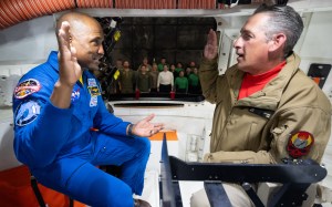 NASA astronaut U.S. Navy Capt. Victor Glover provides the oath of re-enlistment to Aviation Ordnanceman Senior Chief Petty Officer Scott Keating in the Crew Module Test Article (CMTA) during Underway Recovery Test-12 onboard USS Somerset off the coast of California, Saturday, March 29, 2025. During the test, NASA and Department of Defense teams are practicing to ensure recovery procedures are validated as NASA plans to send the Artemis II astronauts around the Moon and splashdown in the Pacific Ocean.