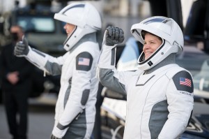 NASA astronauts Anne McClain, right, and Nichole Ayers gesture to friends and family as they prepare to depart the Neil A. Armstrong Operations and Checkout Building for Launch Complex 39A on NASA's Kennedy Space Center to board the SpaceX Dragon spacecraft for the Crew-10 mission launch, Friday, March 14, 2025, at NASA’s Kennedy Space Center in Florida. NASA’s SpaceX Crew-10 mission is the tenth crew rotation mission of the SpaceX Crew Dragon spacecraft and Falcon 9 rocket to the International Space Station as part of the agency’s Commercial Crew Program. McClain, Ayers, JAXA (Japan Aerospace Exploration Agency) astronaut Takuya Onishi, and Roscosmos cosmonaut Kirill Peskov, are scheduled to launch at 7:03 p.m. EDT, from Launch Complex 39A at the NASA's Kennedy Space Center.