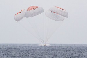 The SpaceX Crew Dragon Endurance spacecraft is seen as it lands with NASA astronauts Anne McClain and Nichole Ayers, JAXA (Japan Aerospace Exploration Agency) astronaut Takuya Onishi, and Roscosmos cosmonaut Kirill Peskov aboard in the Pacific Ocean off the coast of San Diego, Calif., Saturday, Aug. 9, 2025. McClain, Ayers, Onishi, and Peskov are returning after 147 days in space as part of Expedition 73 aboard the International Space Station.