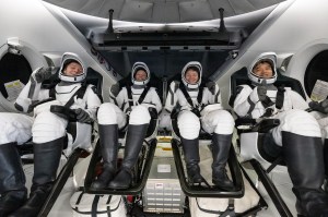 Roscosmos cosmonaut Kirill Peskov, left, NASA astronauts Nichole Ayers, Anne McClain, and JAXA (Japan Aerospace Exploration Agency) astronaut Takuya Onishi are seen inside the SpaceX Dragon Endurance spacecraft onboard the SpaceX recovery ship SHANNON shortly after having landed in the Pacific Ocean off the coast of San Diego, Calif., Saturday, Aug. 9, 2025. McClain, Ayers, Onishi, and Peskov are returning after 147 days in space as part of Expedition 73 aboard the International Space Station.
