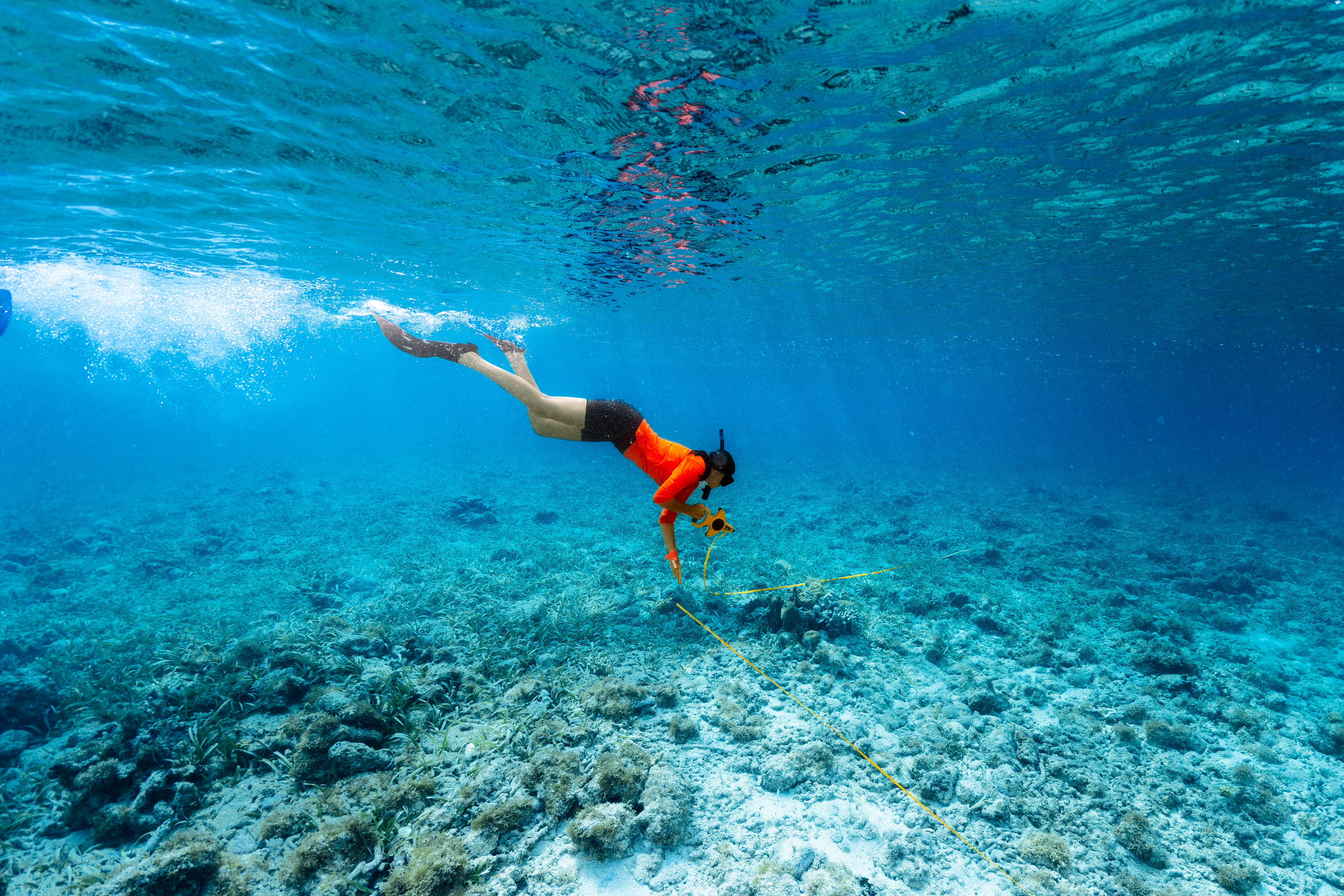 An OCEANOS intern uses an underwater tape measure tool to mark out a section of the sea floor for species mapping.