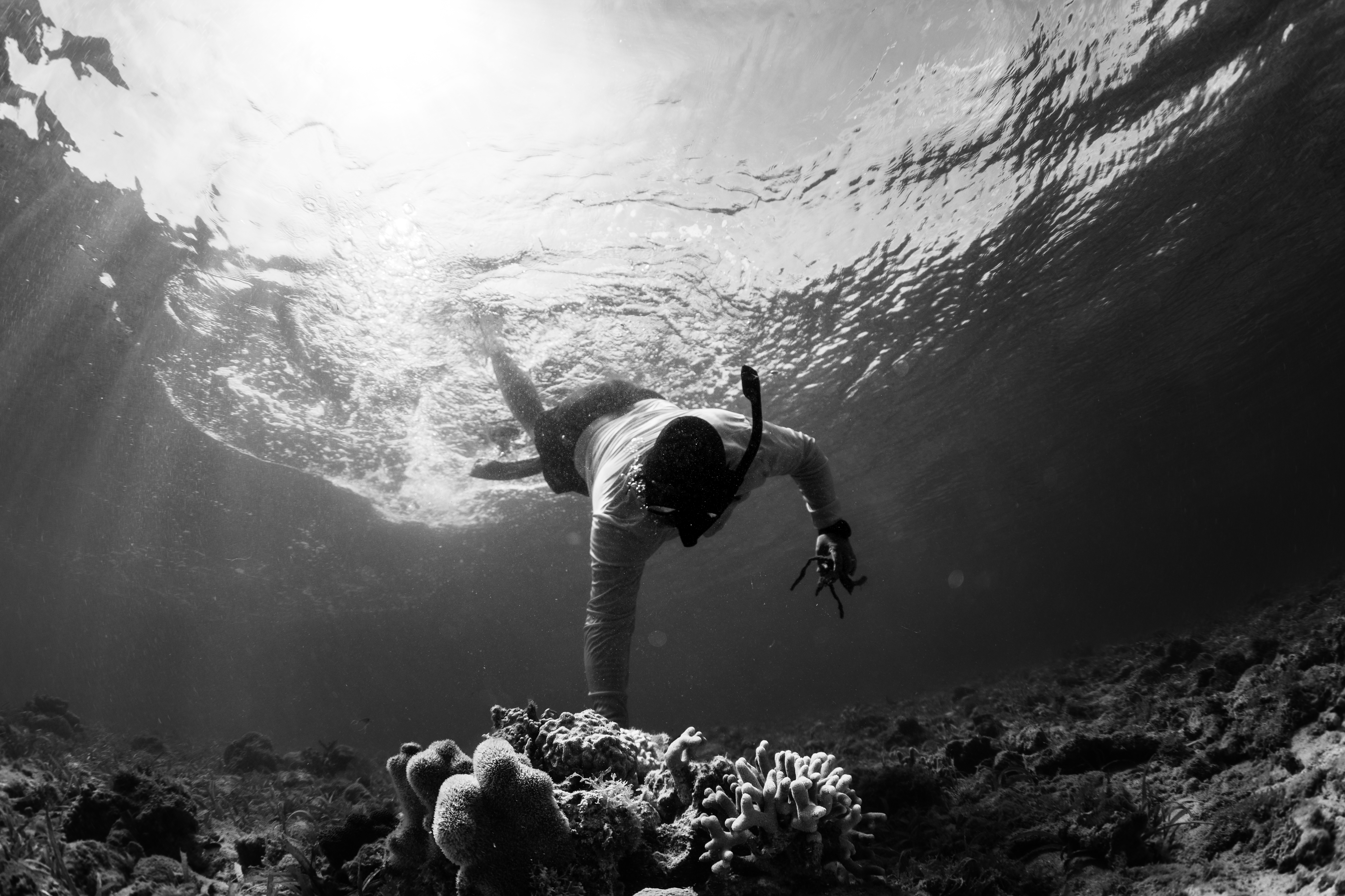 OCEANOS instructor Samuel Suleiman brings a sea rod over to the “coral garden” he is constructing around an endangered species of coral (front left), called pillar coral (Dendrogyra cylindrus), which he discovered while leading the field work portion of the internship at Playa Melones, Puerto Rico. This underwater garden should attract fish and wildlife such as sea urchins, which will give the endangered coral — and the other species in this small reef — a better chance of survival.