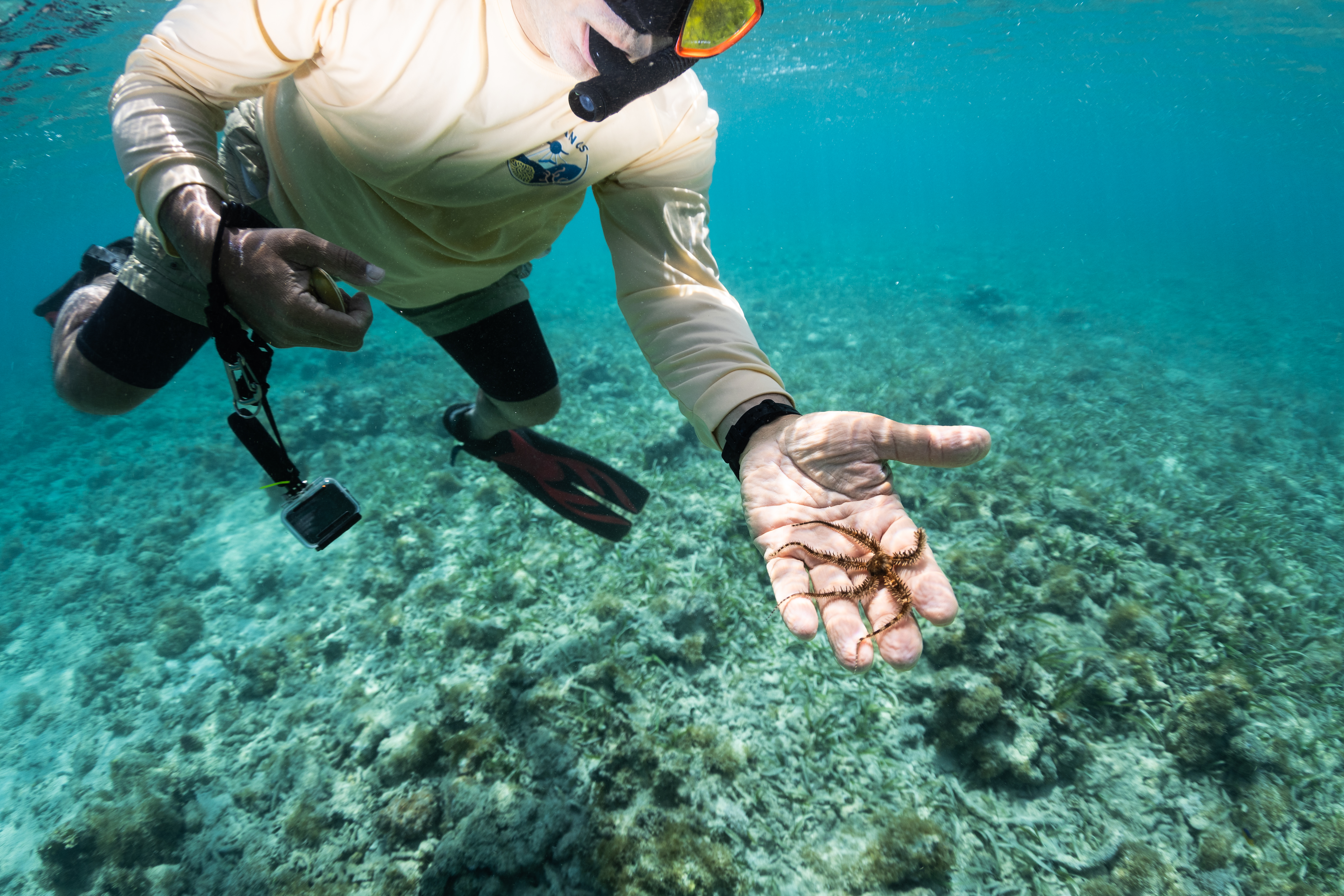 OCEANOS principal investigator Juan Torres-Pèrez holds a common brittle star (Ophiotrix fragilis) found in the waters of Punta Soldado during the fieldwork section of the internship.