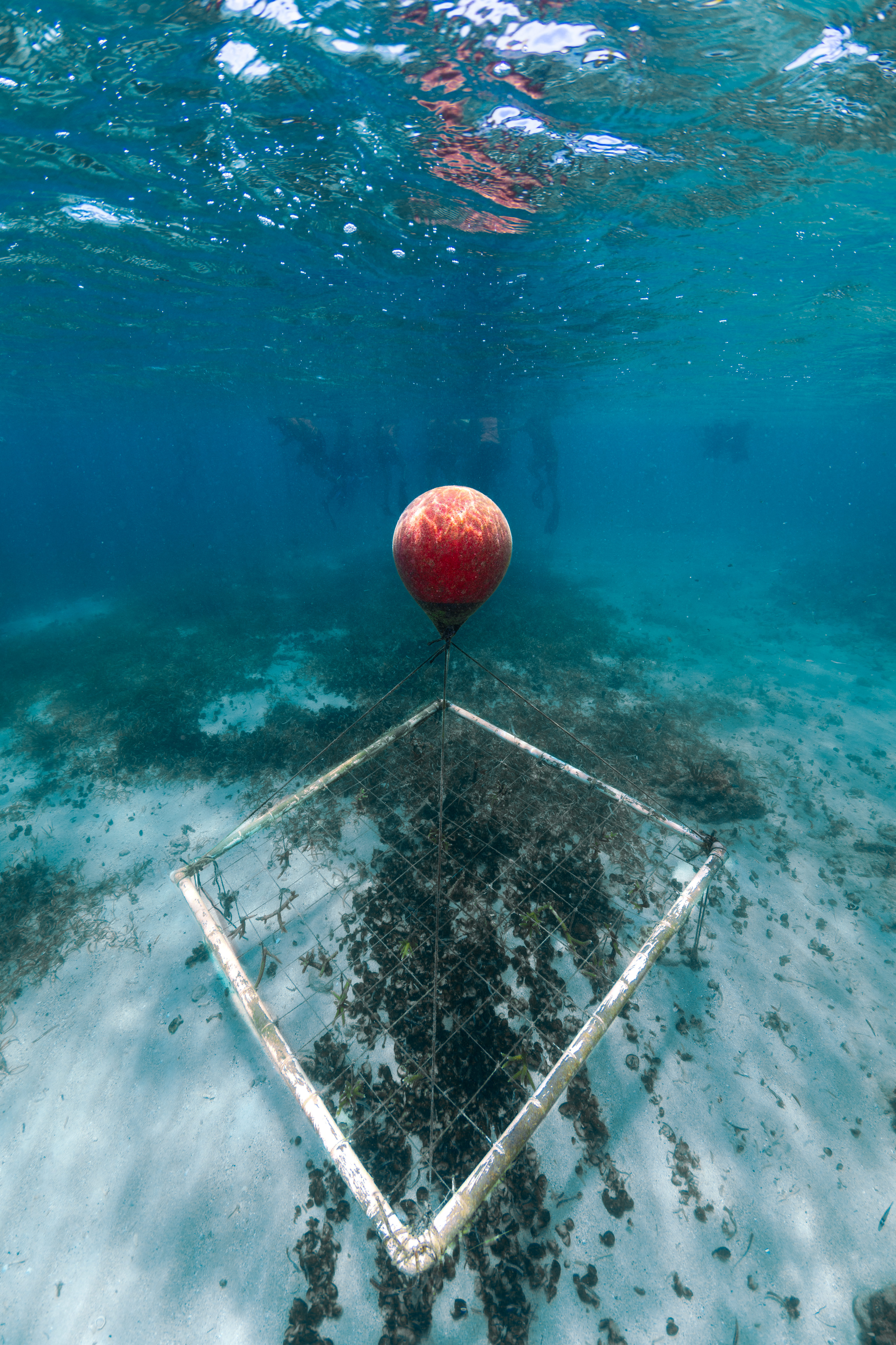 A square frame of roughly 100 elkhorn and staghorn corals drifts in the water of Playa Melones, Puerto Rico, above a sandy sea floor dotted with sea grass and fuzzy balls of cyanobacteria. This particular frame belongs to the Sociedad Ambiente Marino, a marine conservation organization that takes loose coral and anchors them into coral farms such as this one, to grow and mature before being replanted into damaged or vulnerable reefs. The cyanobacteria littering the sea floor is unnatural; likely caused by a land-based source of pollution leaching into nearby waters.