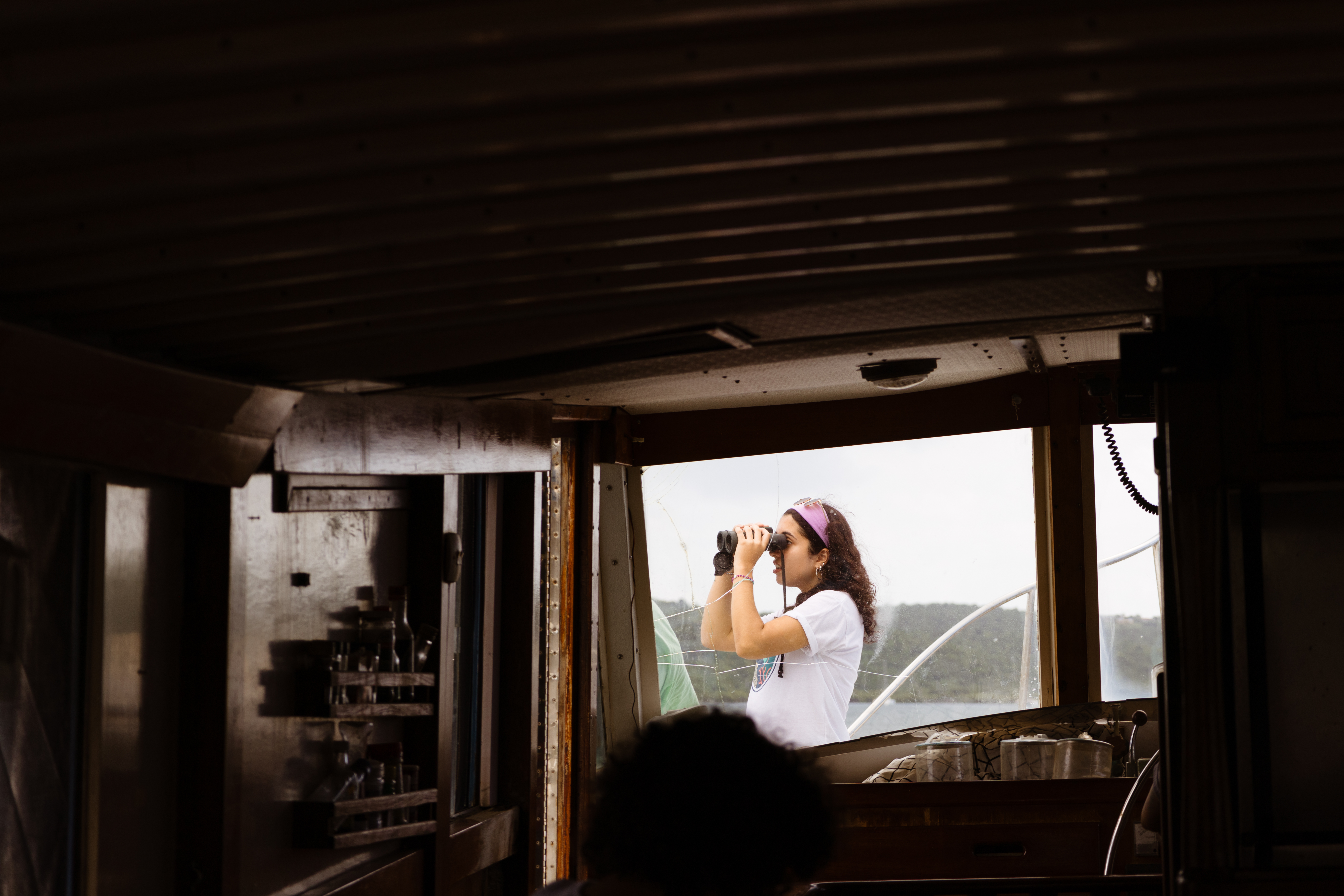 A shot taken inside of a boat with one window visible. Out the window, a student with brown hair and a white t-shirt looks through binoculars, pointed to the left of the frame. Everything inside the boat is dark brown wood.