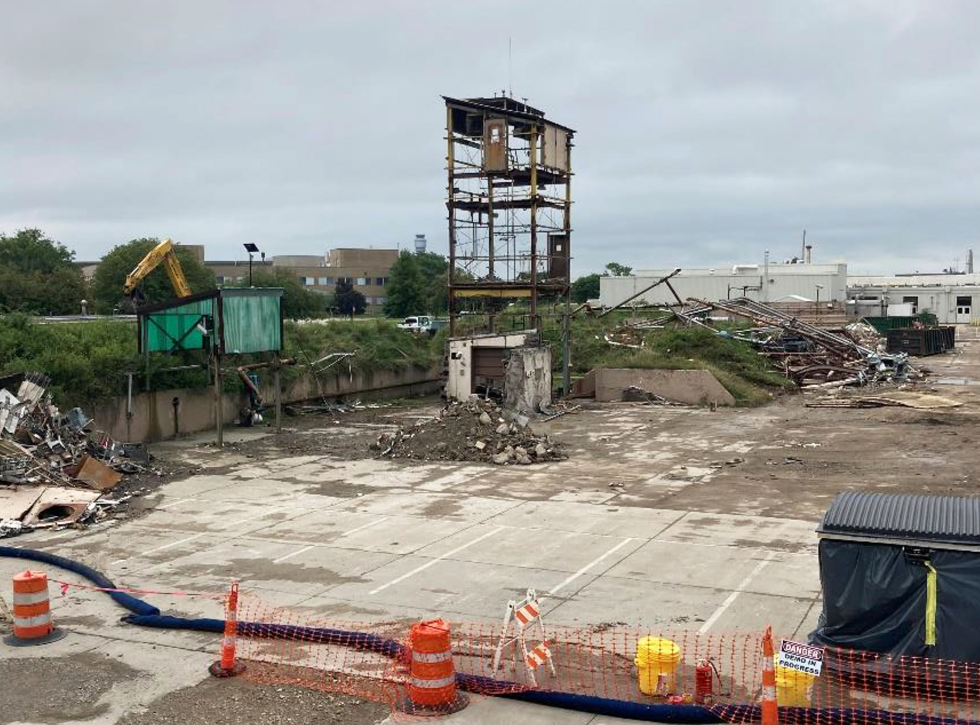 Rocket Lab demolition in 2021 with Cell 13 tower in background.