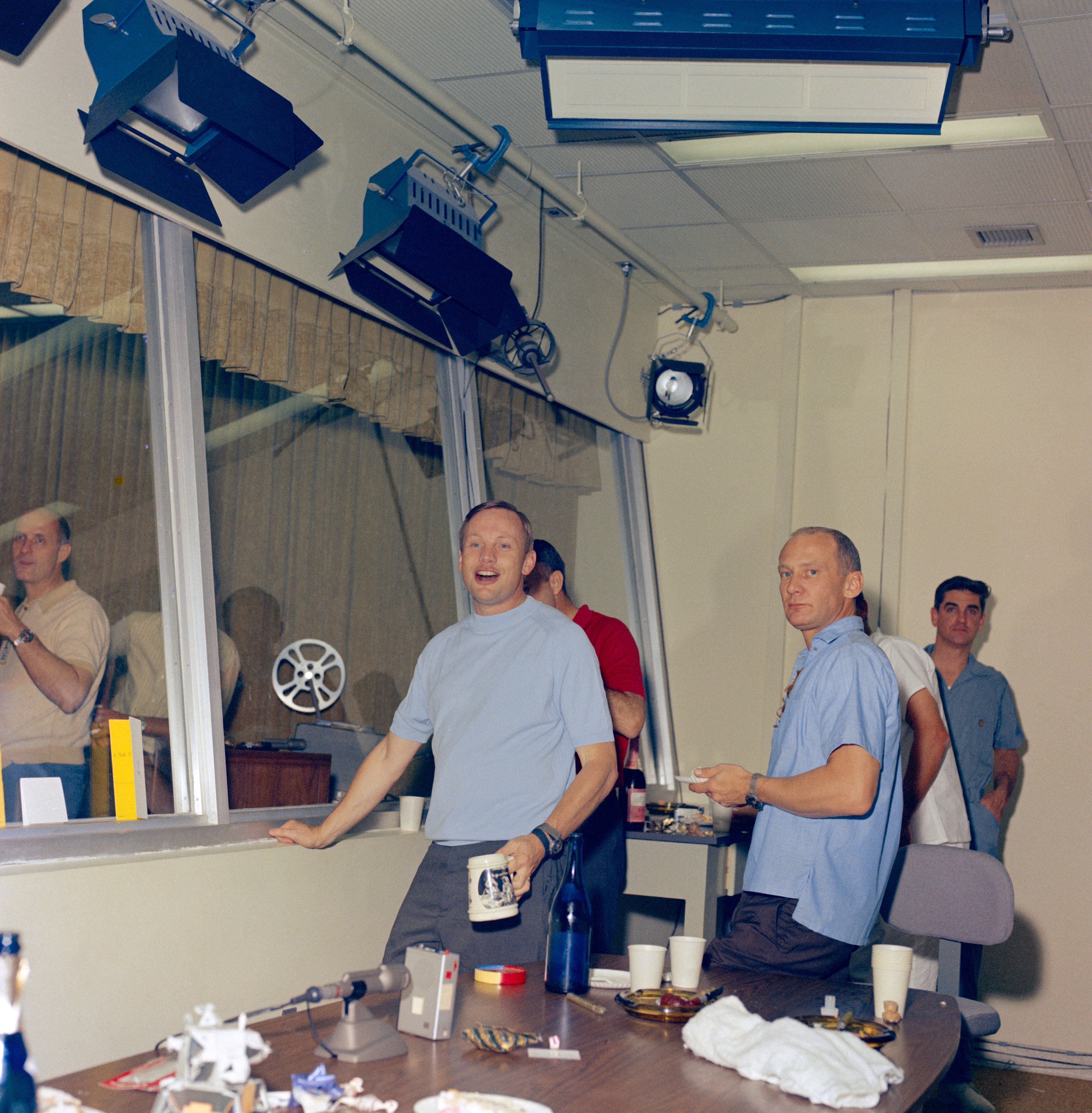 Views of final preparations to birthday cakes and party activities for Astronaut Neil Armstrong in the bldg. 37 LRL CRA Lunar Receiving Laboratory Crew Reception Area.