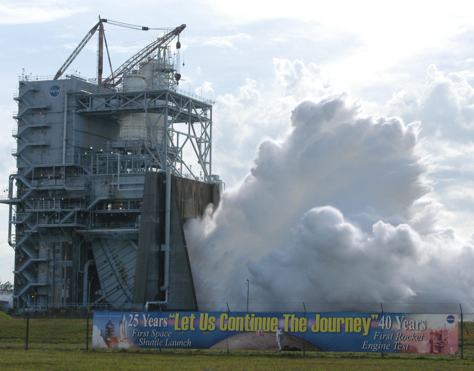 NASA Stennis conducts a space shuttle main engine test on April 21, 2006, at the A-2 Test Stand. The test highlighted two anniversaries: 40 years since the first rocket engine test at NASA Stennis in April 1966 and 25 years since the first space shuttle mission, STS-1, in April 1981.