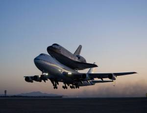 Space shuttle Discovery and its modified 747 carrier aircraft lift off from Edwards Air Force Base early in the morning of Sept. 20, 2009 on the first leg of its ferry flight back to the Kennedy Space Center in Florida.