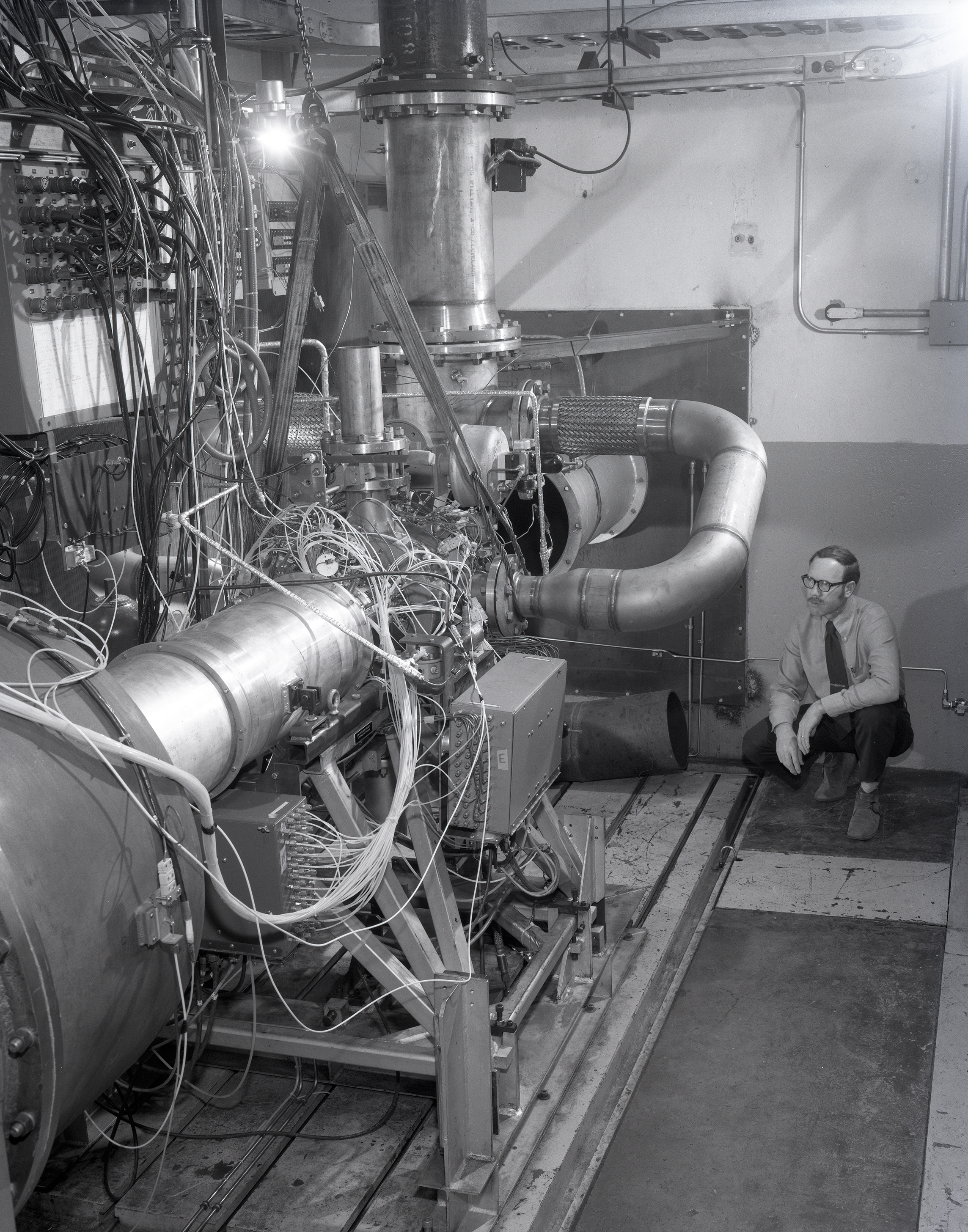 Installation of NASA's Low Cost engine in the Special Projects Laboratory for testing (1973).