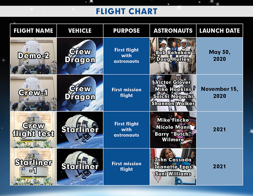 Commercial Crew Program missions include astronauts from NASA, Boeing and from other countries that are partners in the International Space Station. Some will fly on Starliner. Some will fly on the Crew Dragon.