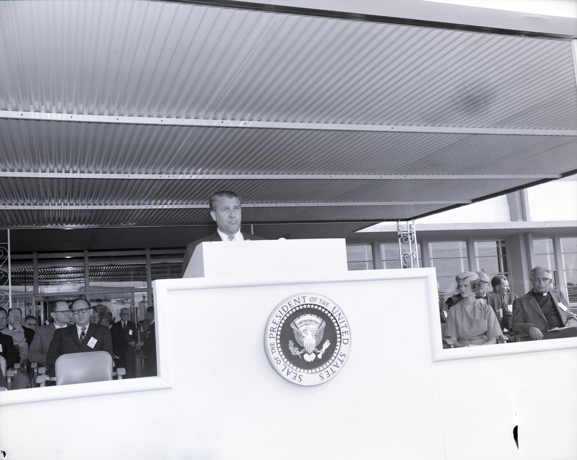 President Dwight Eisenhower formally dedicates NASA’s George C. Marshall Space Flight Center in Huntsville, Alabama, as a new NASA field installation. Previously part of the U.S. Army’s Rocket Research and Development Division in Fort Bliss, Texas, the move brought 4,670 civil service employees to Huntsville and granted NASA 1,840 acres of property and facilities on Redstone Arsenal. Eisenhower is joined at the grand opening event by Dr. Wernher von Braun, the center’s first director.