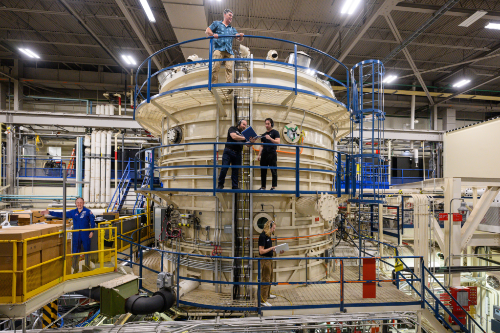 Description: NASA simulates the physical pressure levels astronauts would experience before and during spacewalks using several large-scale chambers that operate below Earth’s atmospheric pressure. This work is primarily performed at NASA’s Johnson Space Center in Houston, through multi-week experiments in which volunteers live and work inside a three-story, 20-foot diameter chamber. There, volunteers experience different atmospheric compositions and protocols to replace nitrogen in the body, and test out research designed to help astronauts avoid hypoxia and decompression sickness. The tests aim to maximize the health and performance of crews and the available operational time for conducting spacewalks.