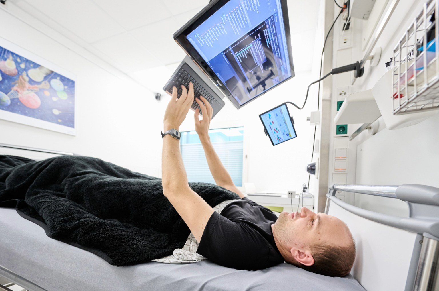 Analog astronaut Andreas Joshi is pictured during a recent bedrest study where he laid with his head tilted downward and he couldn’t sit up for 60 days. He is lying in bed while typing on a computer that is installed over his head. Credit: DLR