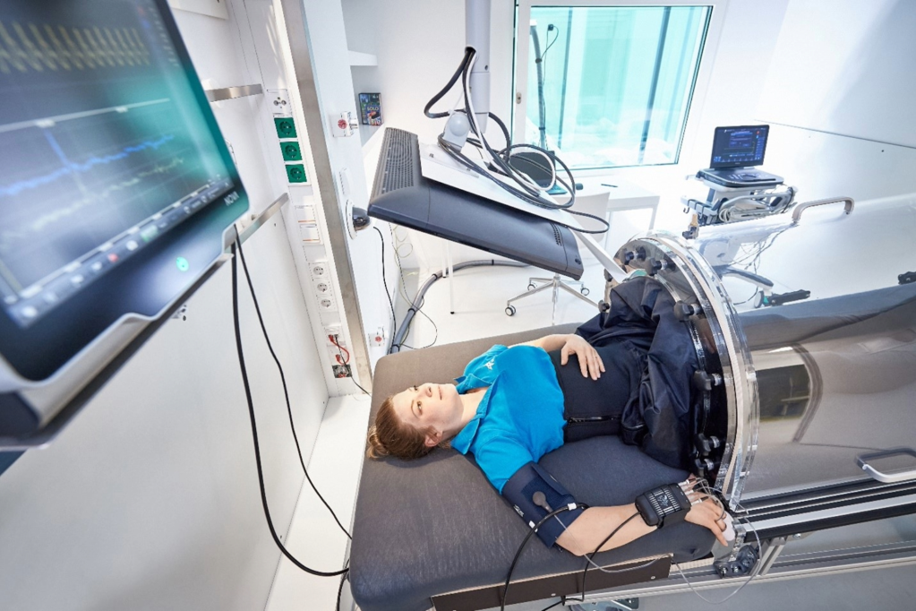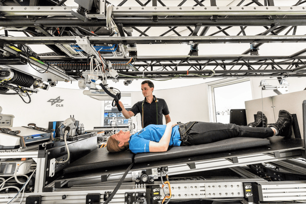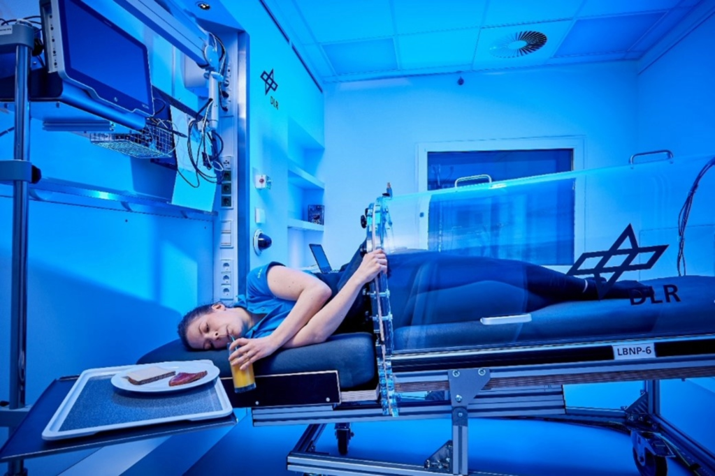 At :envihab, scientists perform bedrest studies to evaluate the health consequences of living in microgravity and test potential interventions — also known as countermeasures — to protect astronaut health in such extreme environments. During the studies, participants lie in bed for weeks or months with their heads tilted slightly downward. Participants do not sit up for anything — not to bathe, use the restroom, play cards with fellow participants, or even to sneeze!