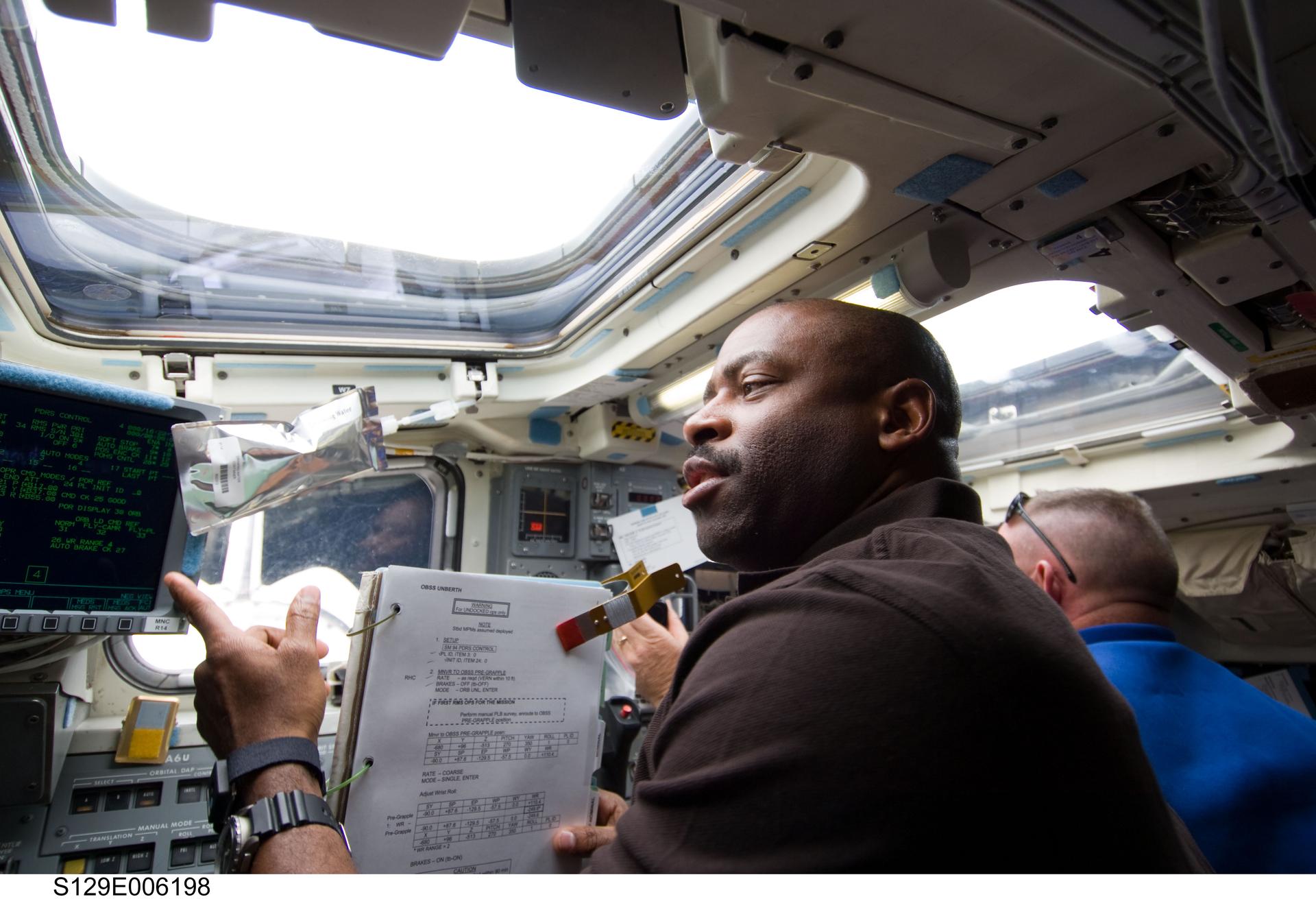 Six STS-129 astronauts were aboard — Commander Charles O. Hobaugh, Pilot Barry E. Wilmore, Mission Specialists Leland Melvin, Mike Foreman, Robert L. Satcher Jr. and Randy Bresnik.