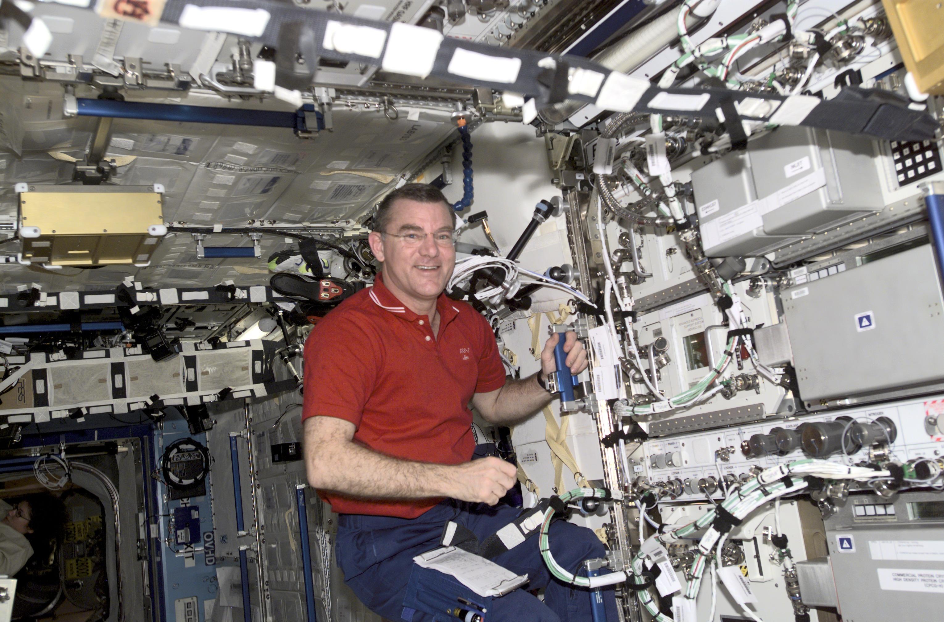NASA Image: ISS002E5965 - Astronaut James Voss with CGBA (keypad of payload in upper right) on the ISS in 2001.+ View Larger Image