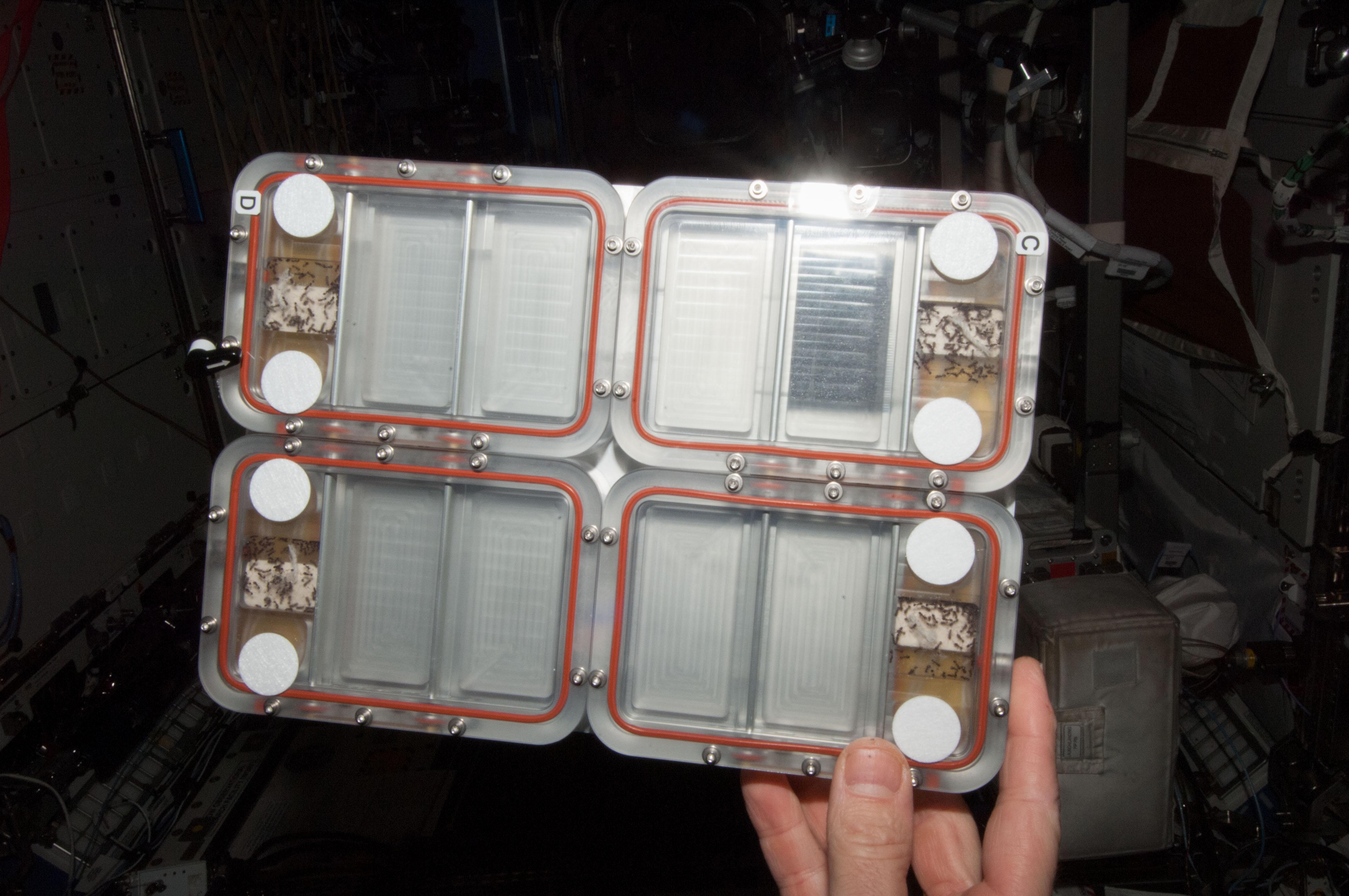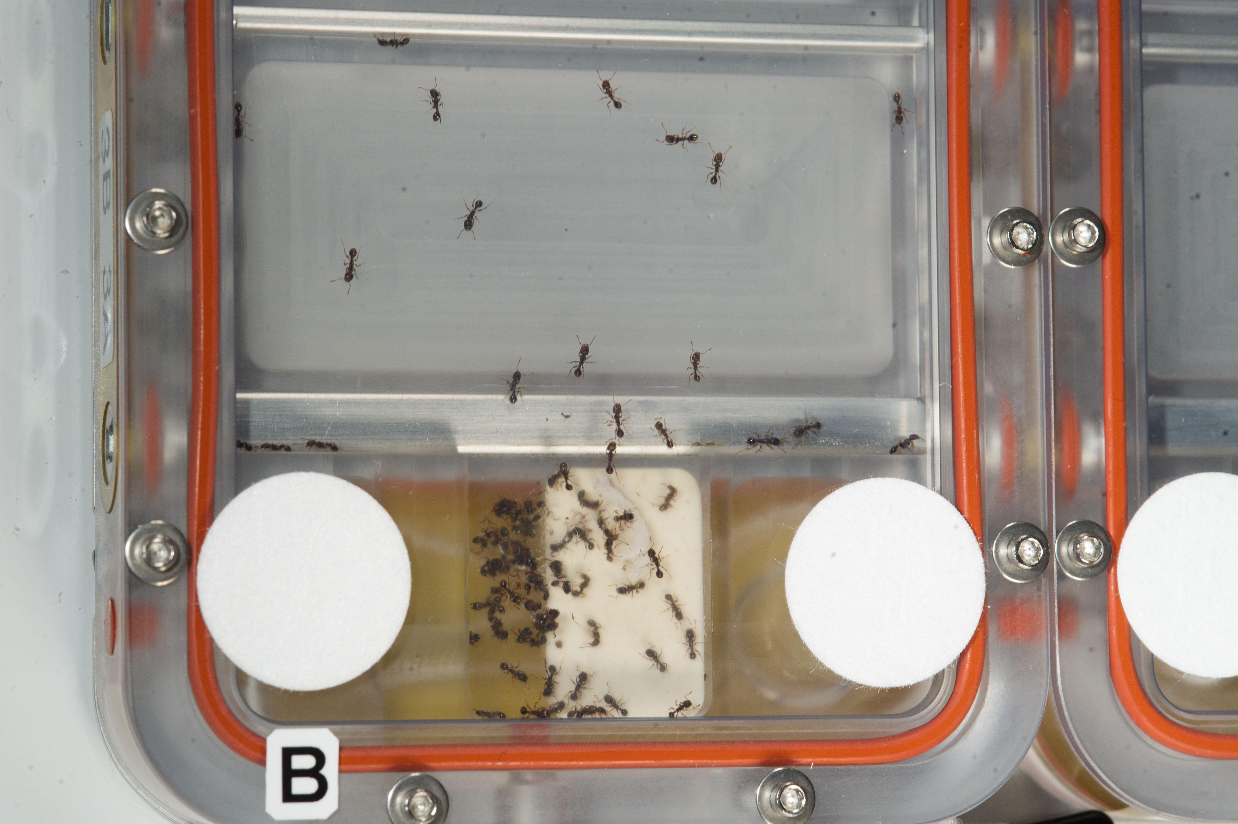 The ants’ movements are videotaped using the HD video cameras on board the ISS and a similar HD camera for the ground controls.