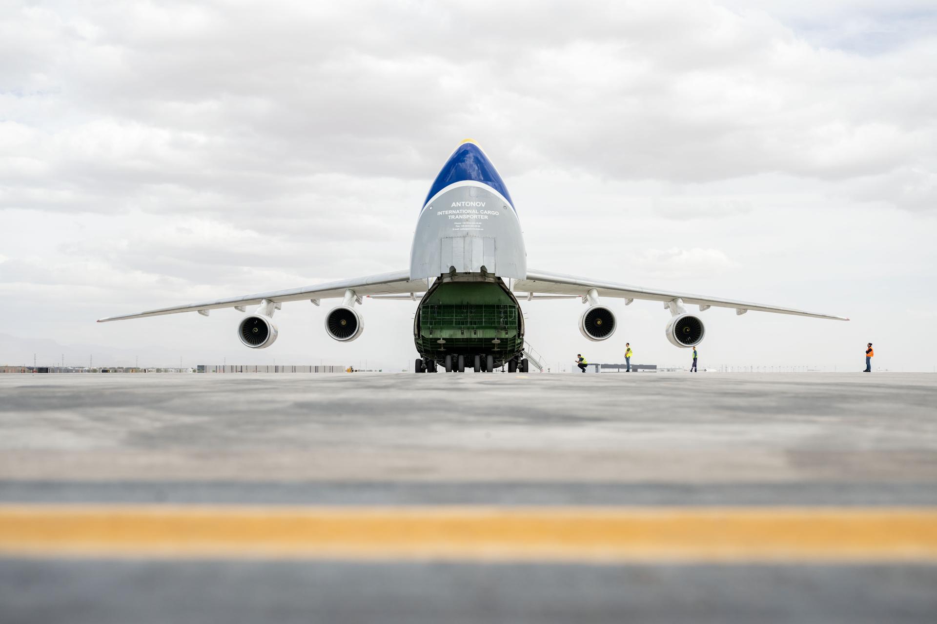 A large cargo aircraft with its nose lifted open reveals HALO's wrapped container. The container is marked with the logo for NASA's Artemis campaign. The scene is set at an airport during late afternoon.