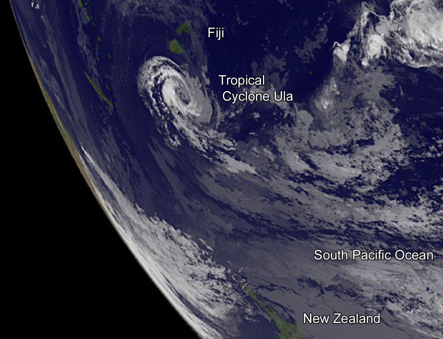 Tropical cyclone Ula’s winds peaked at 115 knots (132 mph) over the weekend of Jan. 9 and 10 Those high winds meant that for a couple days Ula was a category four tropical cyclone on the Saffir-Simpson Hurricane Wind Scale. Ula moved over the waters of the North Fiji Basin between the Fiji Islands and New Caledonia before moving southeastward into the South Fiji Basin.
