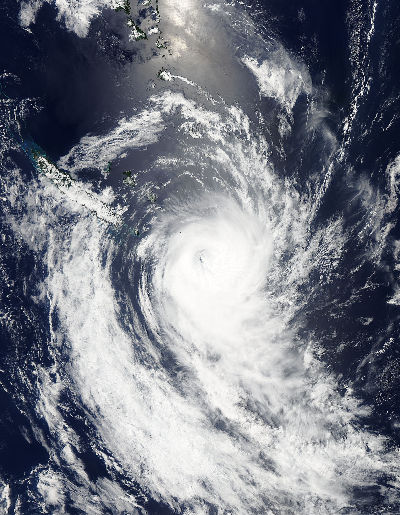The Moderate Resolution Imaging Spectroradiometer or MODIS instrument that flies aboard NASA’s Aqua satellite captured a visible image of Tropical Cyclone Ula on Jan. 5, 2015 as it continued to move west, past Fiji in the South Pacific Ocean. The image showed bands of thunderstorms wrapping into the low-level center from the northeast and around the southern quadrant of the storm.