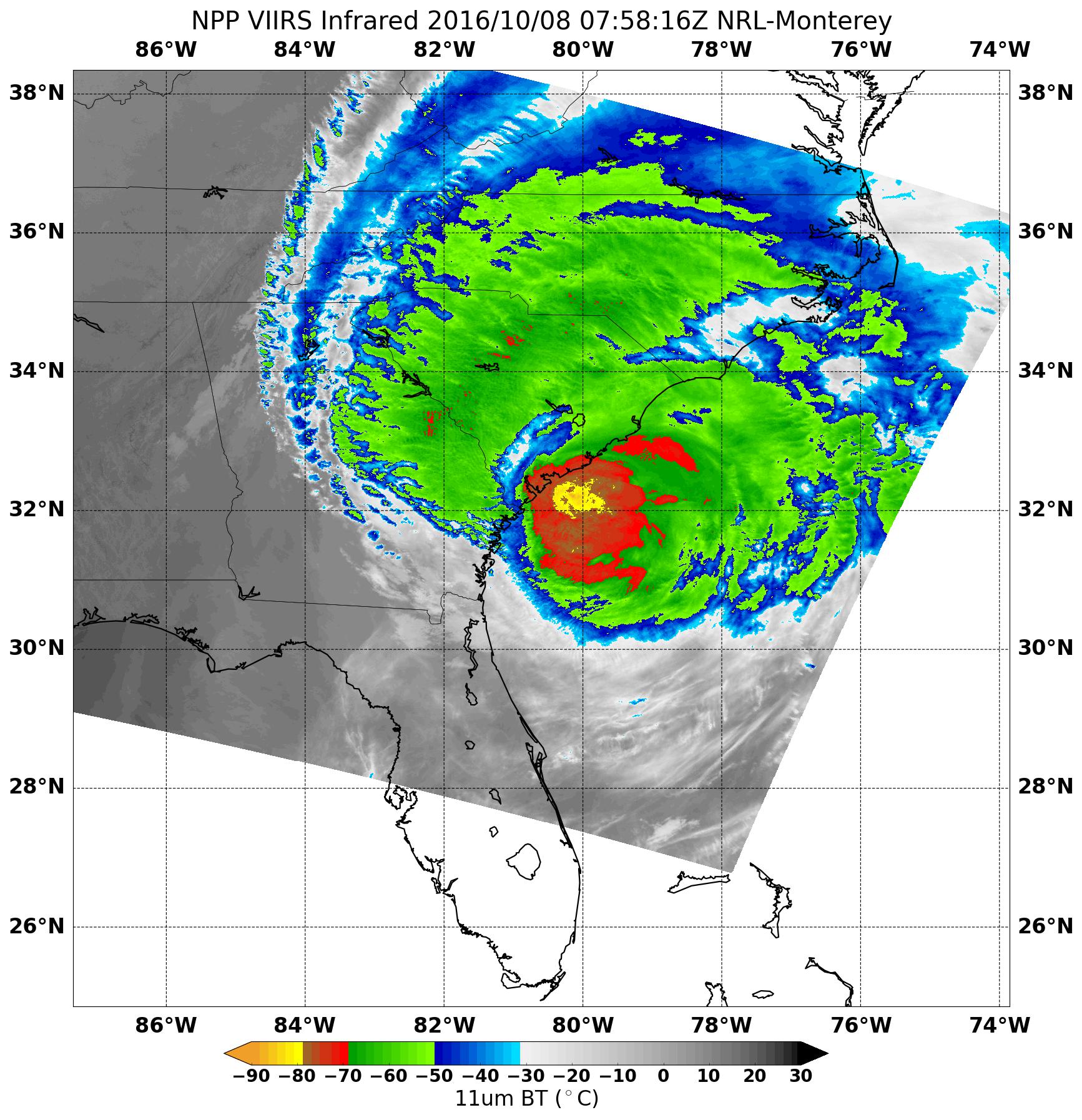 Oct. 8, 2016 – Satellites See Hurricane Matthew’s Center Near Coastal South Carolina