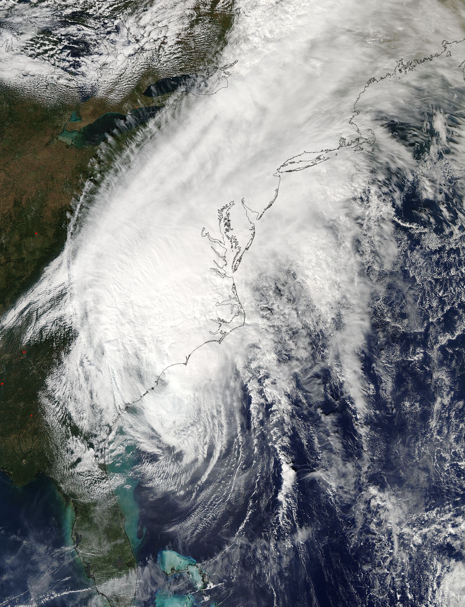 On Sunday, Oct. 9, 2016 at 11:45 a.m. EDT (1545 UTC) the Moderate Resolution Imaging Spectroradiometer or MODIS instrument aboard NASA’s Terra satellite captured a last look at Post-Tropical Cyclone Matthew as it was being absorbed by a cold front along the U.S. Eastern Seaboard.